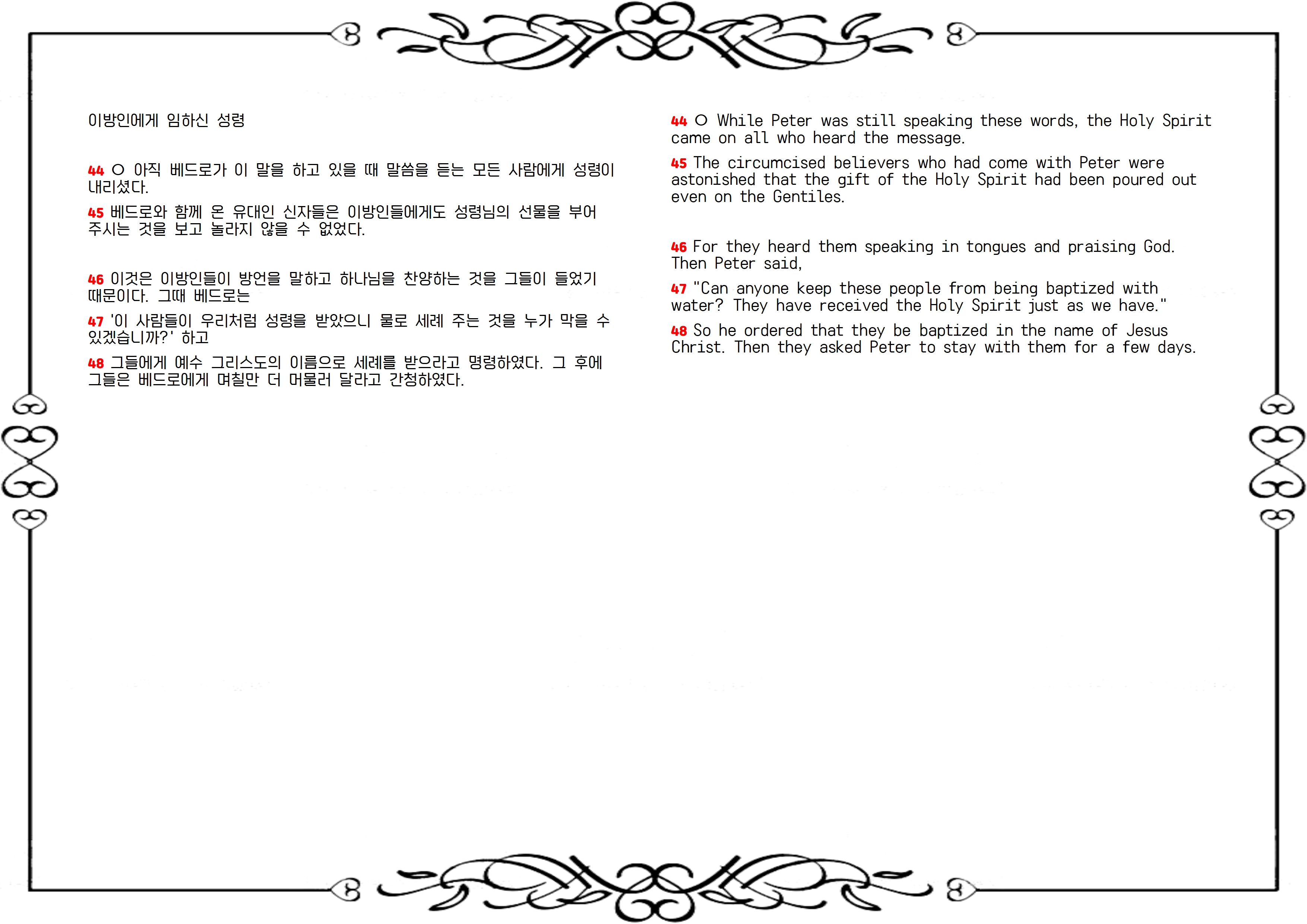 44 ○ 아직 베드로가 이 말을 하고 있을 때 말씀을 듣는 모든 사람에게 성령이 내리셨다.