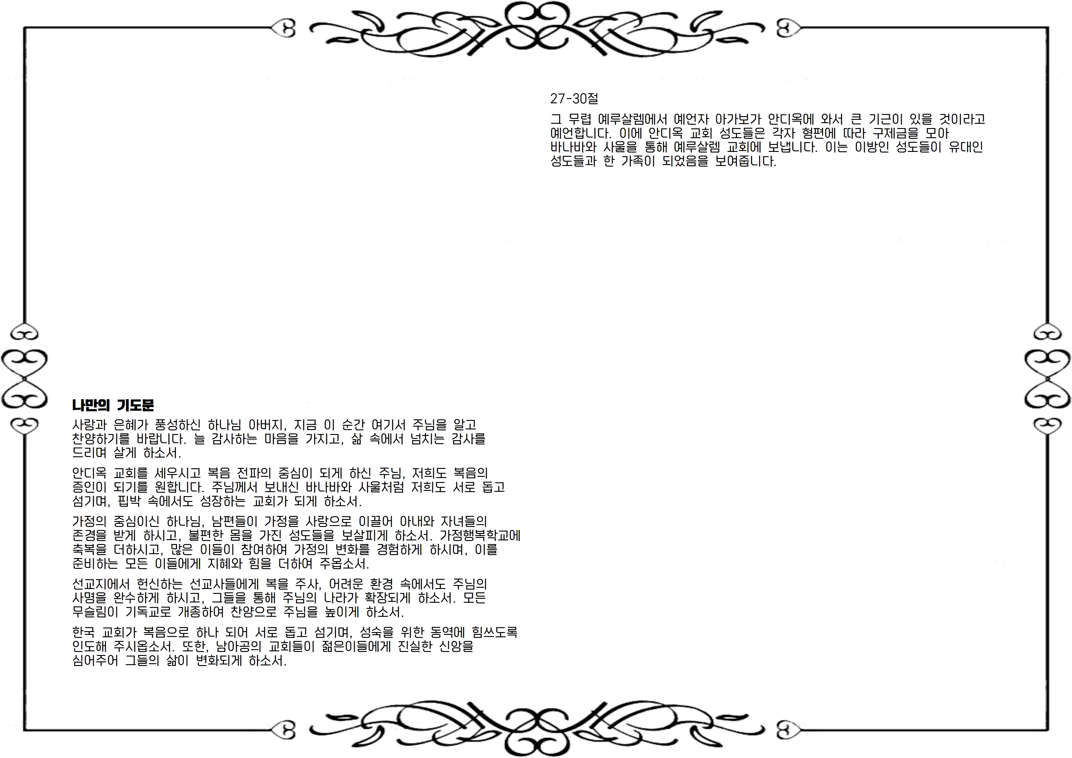 안디옥 교회를 세우시고 복음 전파의 중심이 되게 하신 주님, 저희도 복음의 증인이 되기를 원합니다. 주님께서 보내신 바나바와 사울처럼 저희도 서로 돕고 섬기며, 핍박 속에서도 성장하는 교회가 되게 하소서.