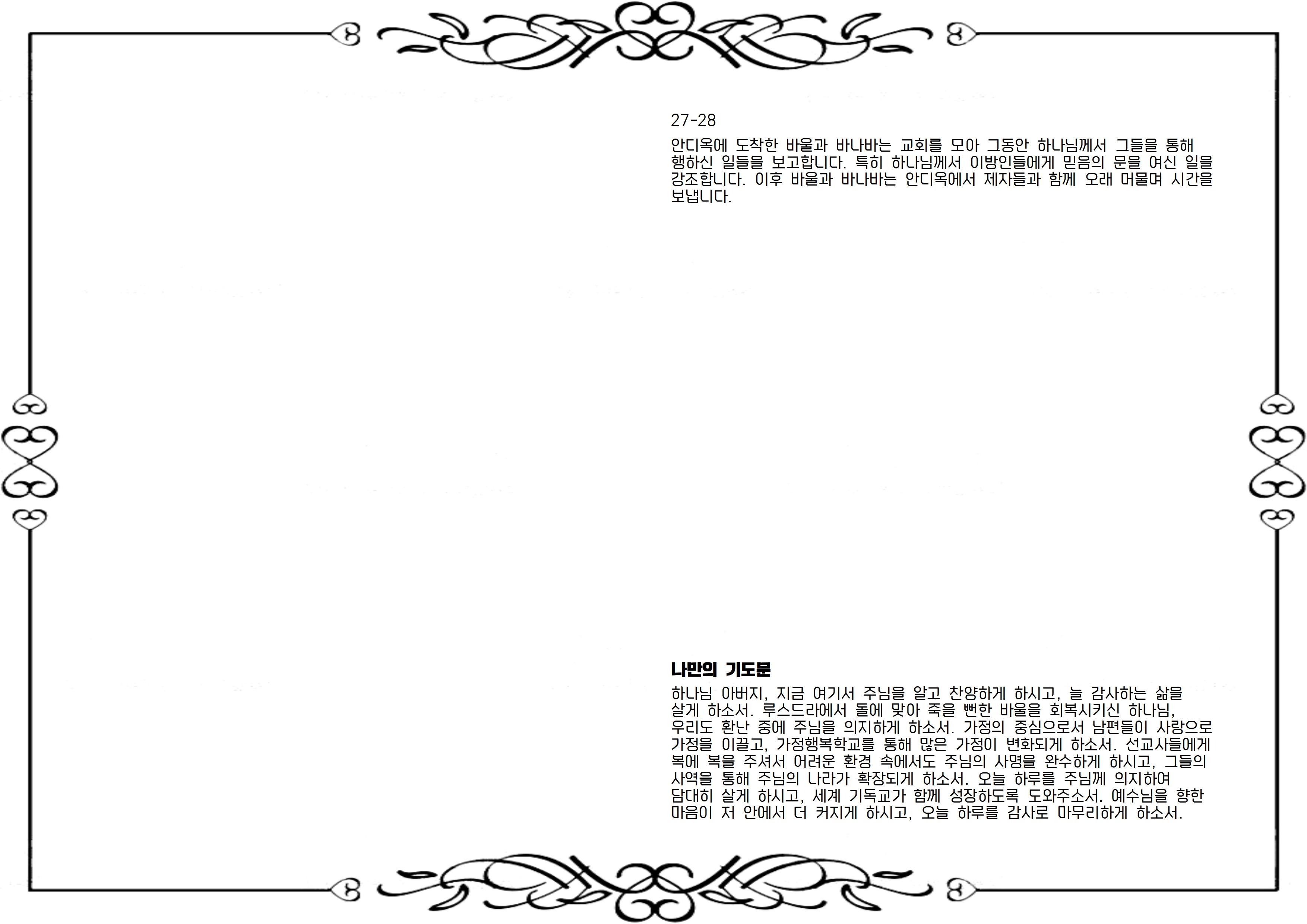 하나님 아버지, 지금 여기서 주님을 알고 찬양하게 하시고, 늘 감사하는 삶을 살게 하소서. 루스드라에서 돌에 맞아 죽을 뻔한 바울을 회복시키신 하나님, 우리도 환난 중에 주님을 의지하게 하소서. 가정의 중심으로서 남편들이 사랑으로 가정을 이끌고, 가정행복학교를 통해 많은 가정이 변화되게 하소서. 선교사들에게 복에 복을 주셔서 어려운 환경 속에서도 주님의 사명을 완수하게 하시고, 그들의 사역을 통해 주님의 나라가 확장되게 하소서. 오늘 하루를 주님께 의지하여 담대히 살게 하시고, 세계 기독교가 함께 성장하도록 도와주소서. 예수님을 향한 마음이 저 안에서 더 커지게 하시고, 오늘 하루를 감사로 마무리하게 하소서.