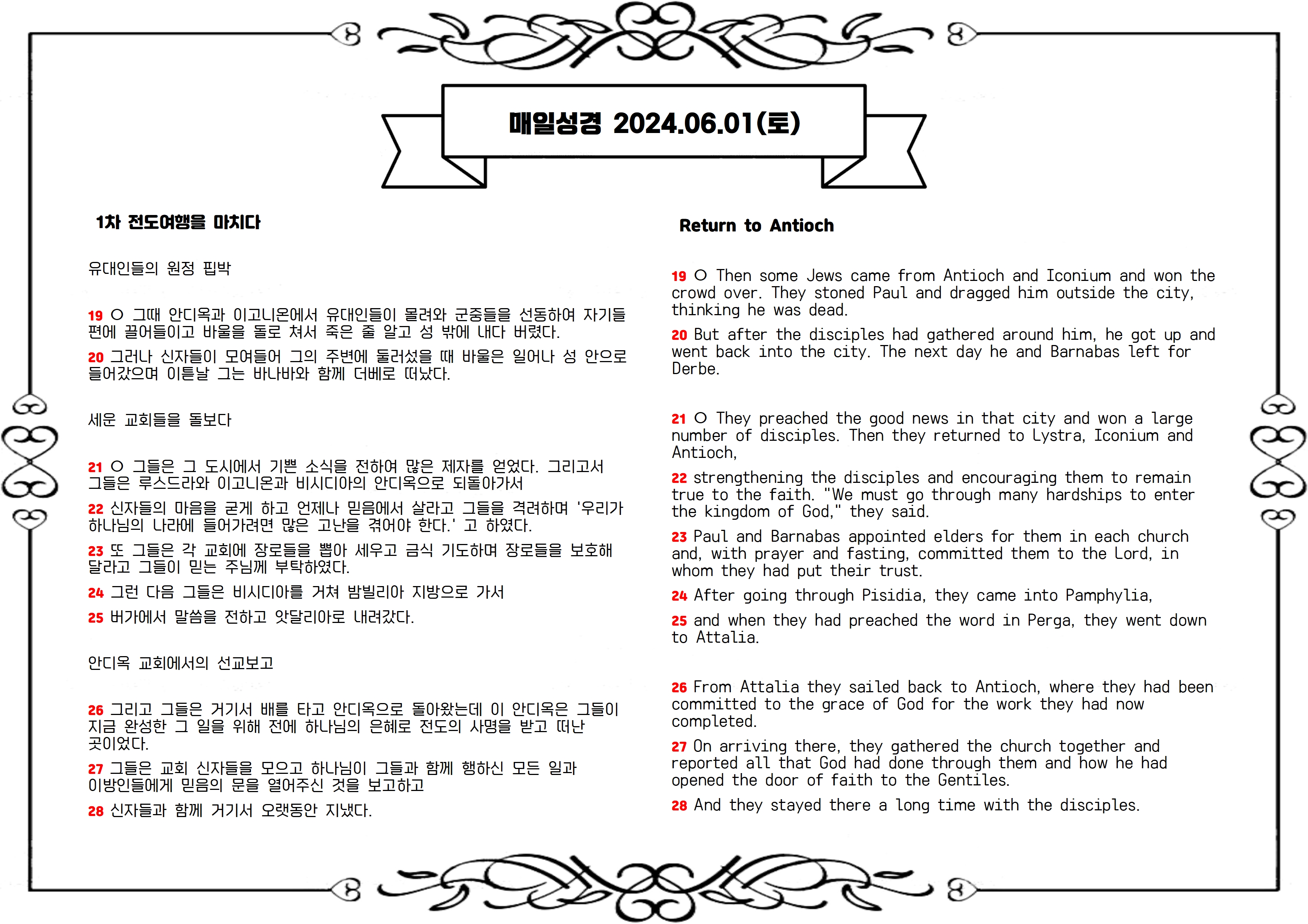 루스드라에서 돌에 맞아 죽을 뻔한 바울은 기적적으로 회복하여 복음을 전파하던 지역들을 다시 방문합니다. 바울과 바나바는 그 지역의 성도들을 굳게 세우고 교회를 돌볼 장로들을 세운 후 안디옥으로 돌아가 소아시아 선교 활동에 대해 보고합니다.