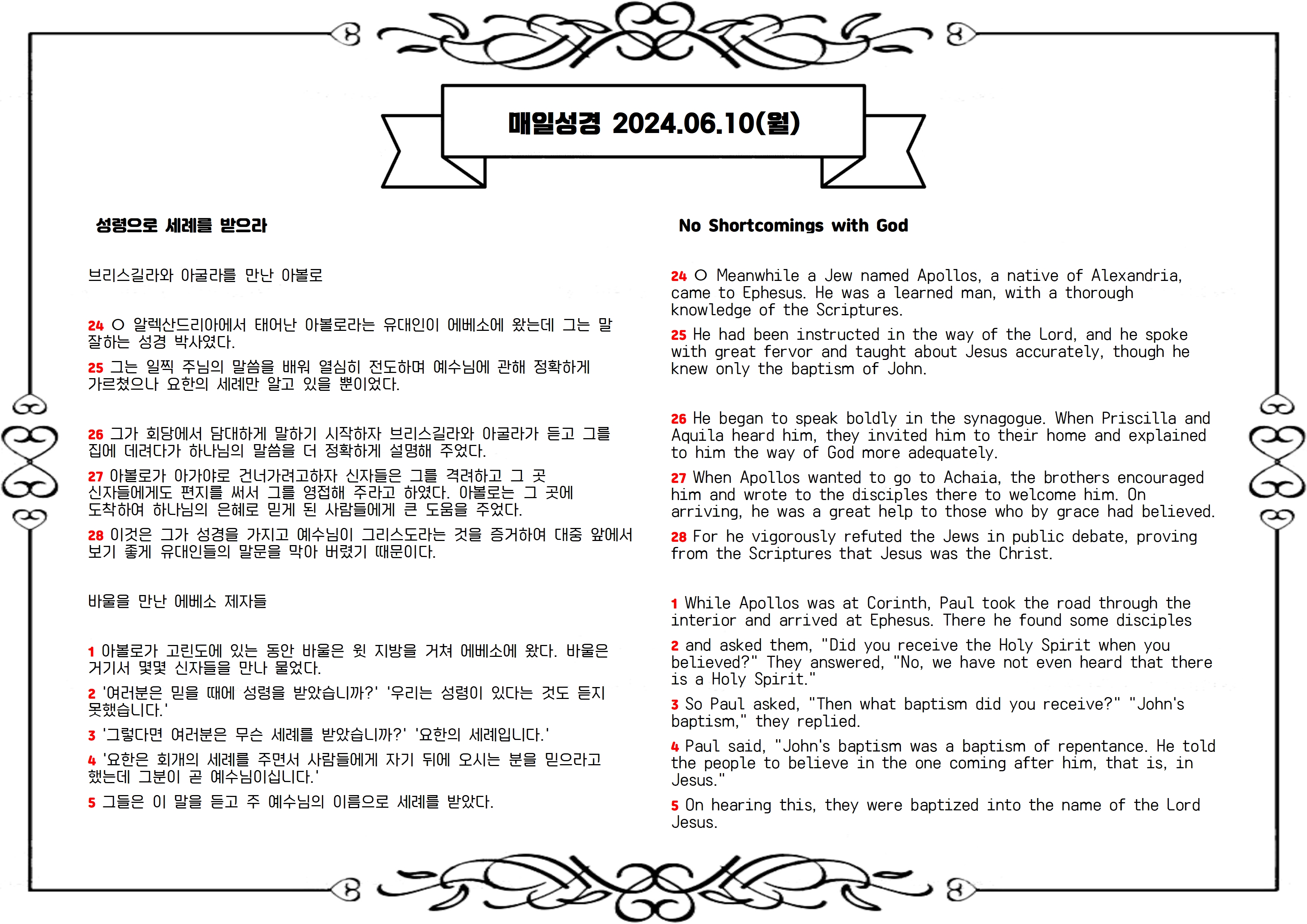 24 ○ 알렉산드리아에서 난 아볼로라 하는 유대인이 에베소에 이르니 이 사람은 언변이 좋고 성경에 능통한 자라