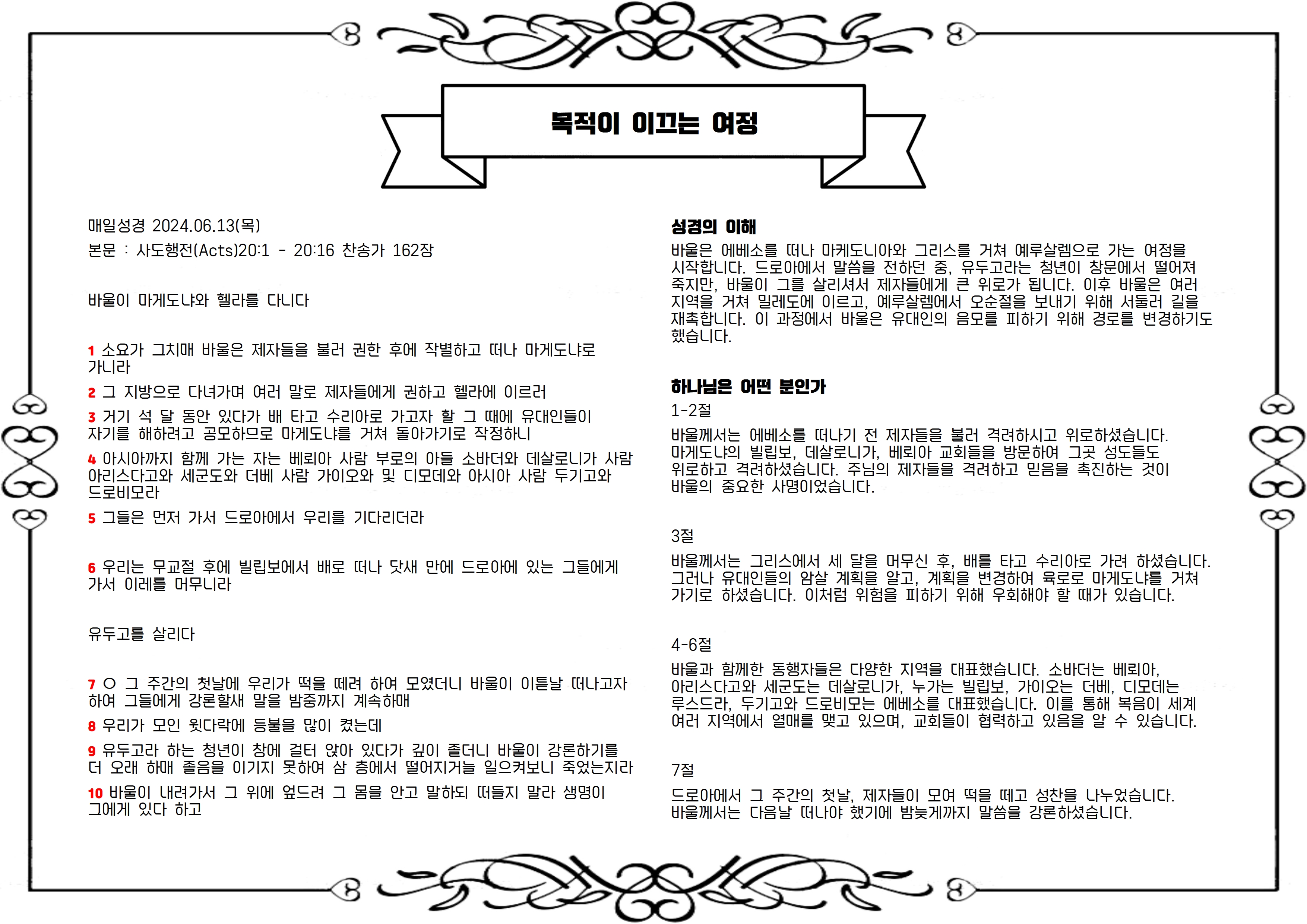 바울은 에베소를 떠나 마케도니아와 그리스를 거쳐 예루살렘으로 가는 여정을 시작합니다. 드로아에서 말씀을 전하던 중, 유두고라는 청년이 창문에서 떨어져 죽지만, 바울이 그를 살리셔서 제자들에게 큰 위로가 됩니다. 이후 바울은 여러 지역을 거쳐 밀레도에 이르고, 예루살렘에서 오순절을 보내기 위해 서둘러 길을 재촉합니다. 이 과정에서 바울은 유대인의 음모를 피하기 위해 경로를 변경하기도 했습니다.