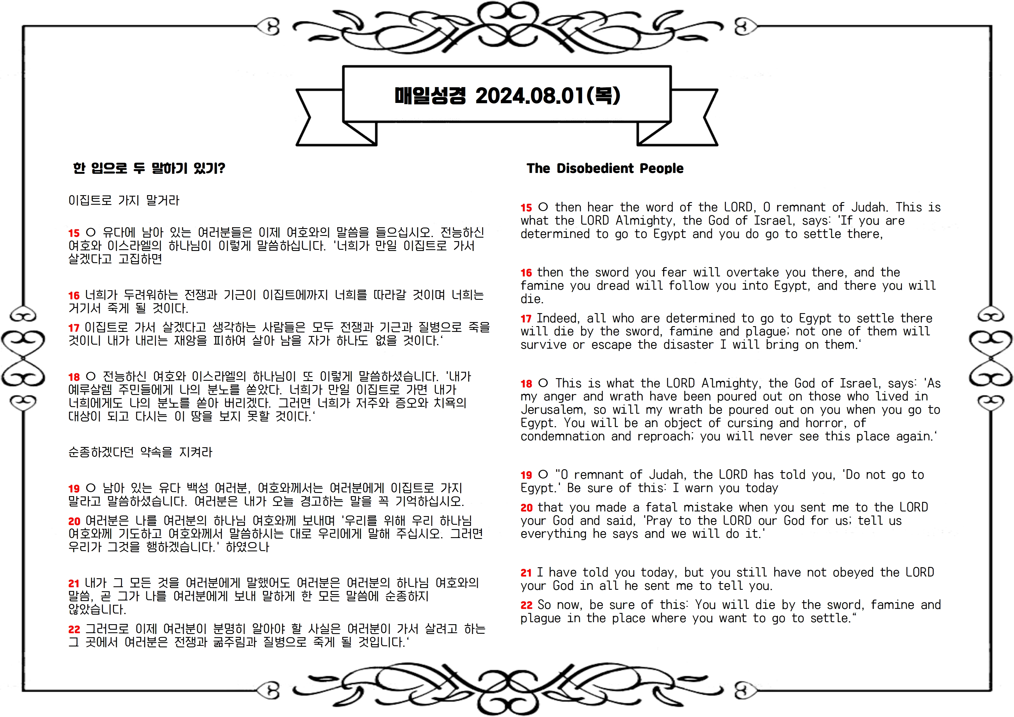 유다 백성들에게 하나님의 경고를 전하셨던 예레미야 선지자처럼, 저희도 하나님의 말씀을 듣고 순종하는 삶을 살기를 원합니다. 이집트로 가지 말라는 하나님의 말씀에 불순종하여 멸망을 자초했던 유다 백성들의 전철을 밟지 않게 하소서.