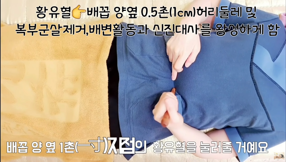 네 번째는 황유혈이다. 배꼽 양옆 1cm에 위치해있다. 복식 호흡하며 오른쪽, 왼쪽 각각 3회 지압한다.