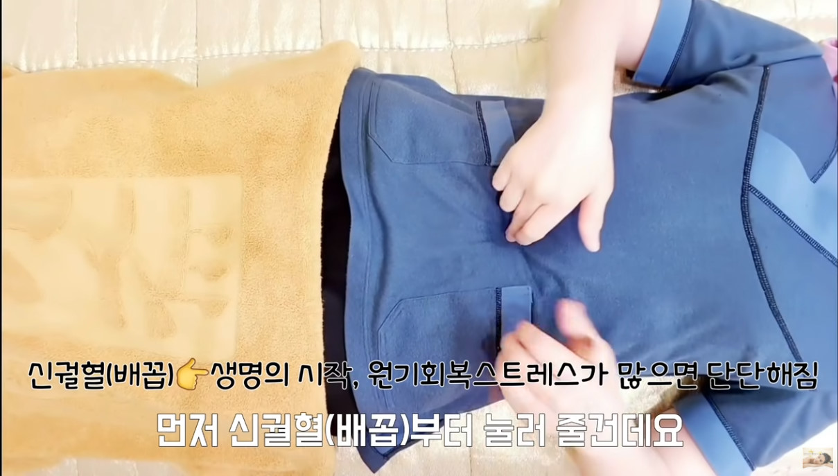 첫 번째는 신궐혈이다. 신궐혈의 위치는 배꼽이며, 지압봉으로 눌러 줄 때는 복식호흡을 해야 한다. 호흡을 들이마셔 배를 볼록하게 했다가 내 쉬면서 각 3회씩 지압을 한다.