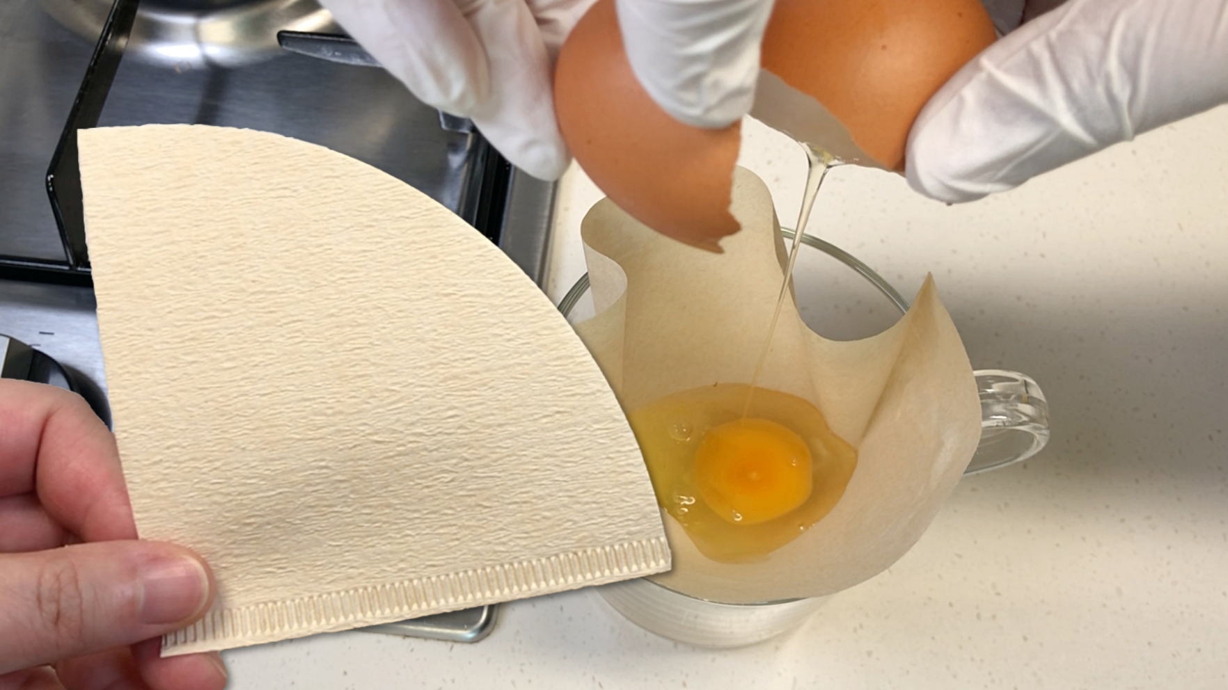 컵에 커피필터를 고정시키고 달걀을 터트려주세요.