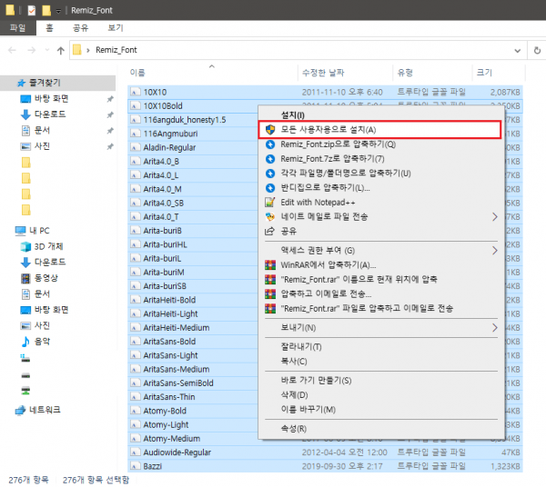 폰트 설치는 압축을 푸신후