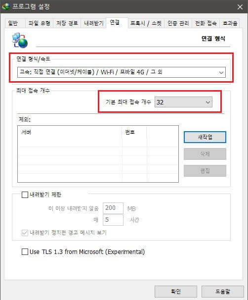 2. '연결' 탭으로 들어가서 '연결 형식/속도'를 고속으로 선택하고, '최대 접속 개수'를 32개로 선택합니다.