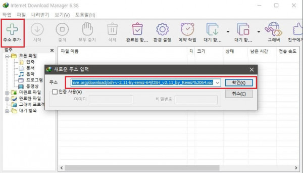 3. 설정 완료 후 '주소 추가'를 눌러 다운 받을 자료 링크를 붙여 넣은 후 '확인'을 눌러줍니다.