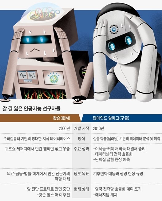 진 상태이다. 반면 아마존·페이스북·마이크로소프트 같은 경쟁자들은 승승장구하면서 주가가 몇배씩 급등했다. 조대곤 KAIST 경영대학 교수는 “아마존이나 페이스북은 AI를 활용해 음성인식 비서나 이미지 인식 같은 실질적인 제품이나 서비스를 선보인 반면 선구자였던 IBM은 ‘암 정복’처럼 당장 성과를 기대할 수 없는 거대한 목표에 매달렸다”고 말했다.