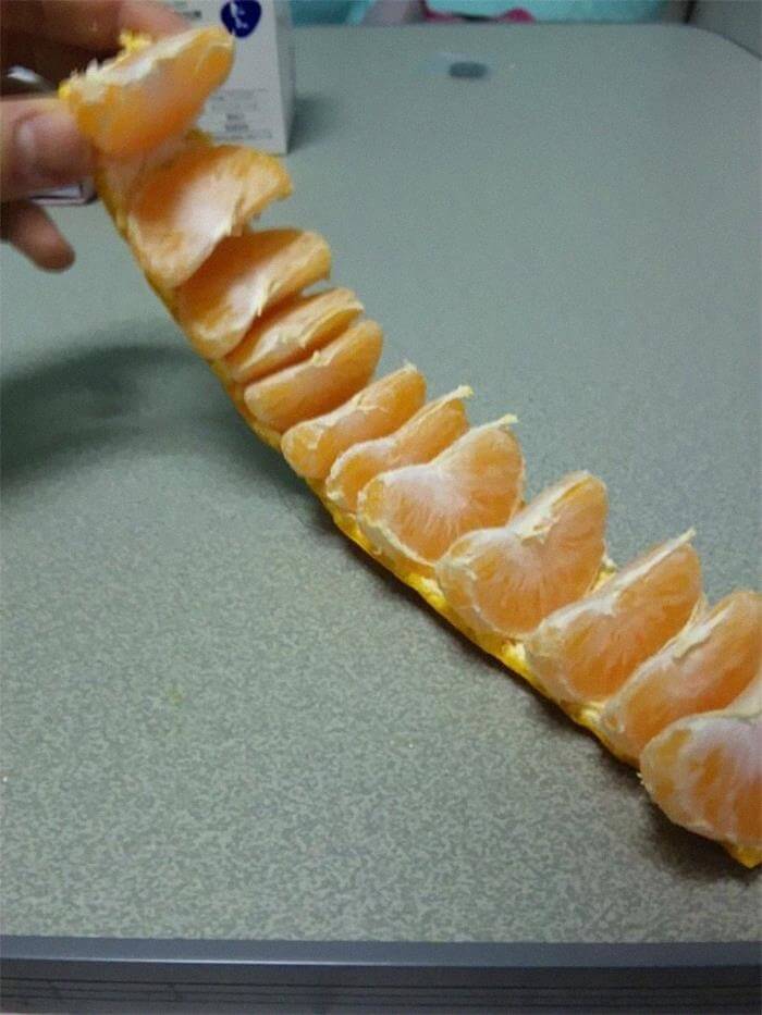껍질의 윗부분과 아랫 부분을 잘라낸 다음 옆면을 자르면 깨끗한 오렌지색 선이 펴집니다. 아이들이 힘들게 오렌지 껍질을 까고 있지 않아도 되니, 점심 도시락으로 좋습니다. 학교 식당에서 오렌지를 까기 위해 고군분투 하던 시절이 기억나시지 않습니까? 우리가 이 트릭을 진작에 알았더라면 좋았을 것입니다.