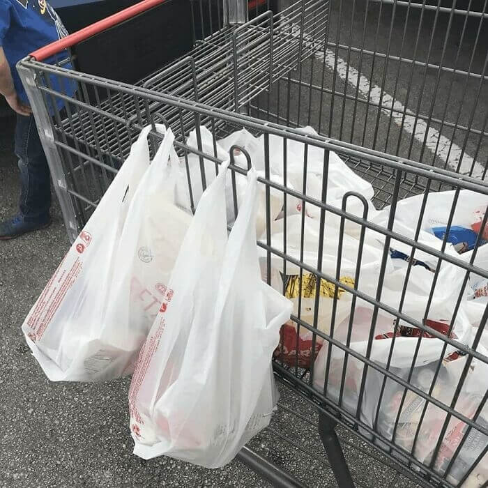 음식을 찌그러트리는 대신, 쇼핑 카트의 옆과 뒷면의 고리에 봉투를 걸어 공간을 확보해보십시오. 망가지기 쉬운 음식을 안정적으로 담을 수 있을 뿐 아니라 봉투를 집으로 가져갈 때도 더욱 편할 것입니다.