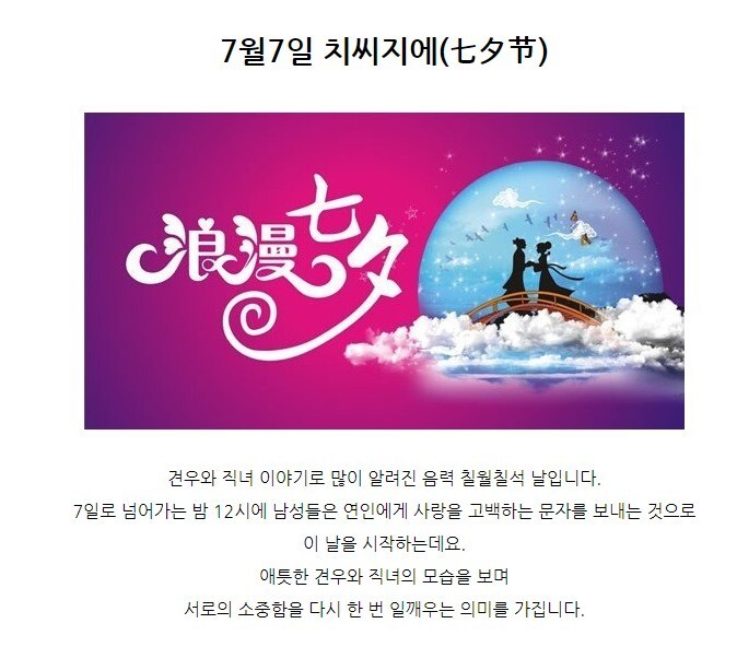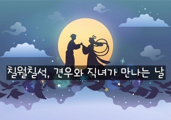 옛날 하늘의 목동인 견우(牽牛)와 옥황상제의 손녀인 직녀(織女)가 서로 사랑에 빠져 일은 않고 게으름을 피우자, 화가 난 옥황상제는 그들 두 사람을 은하수 동쪽과 서쪽으로 갈라 놓았다.