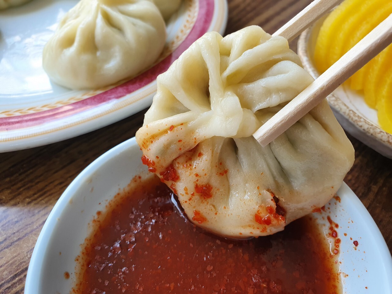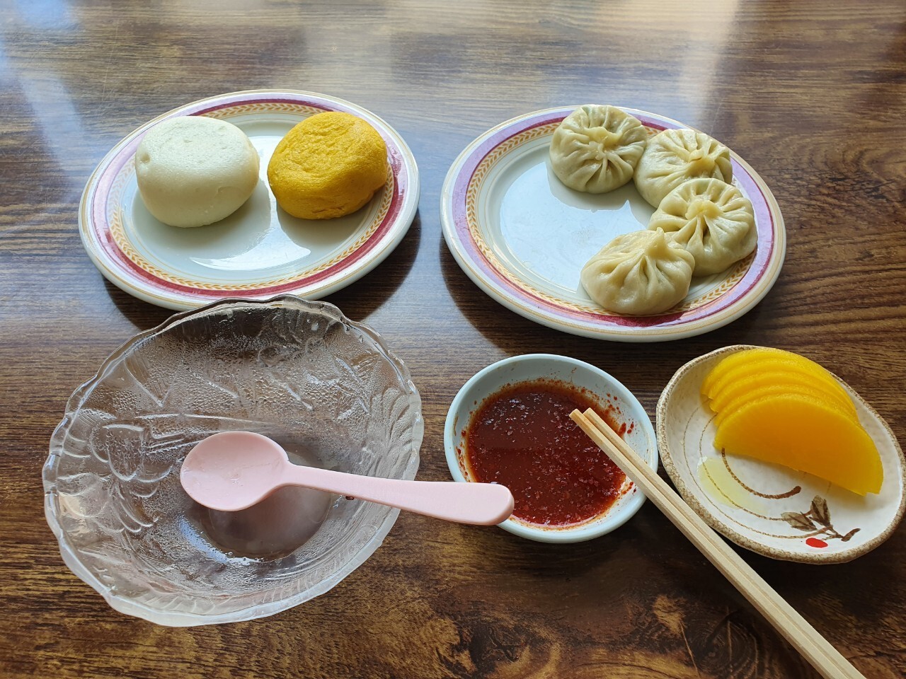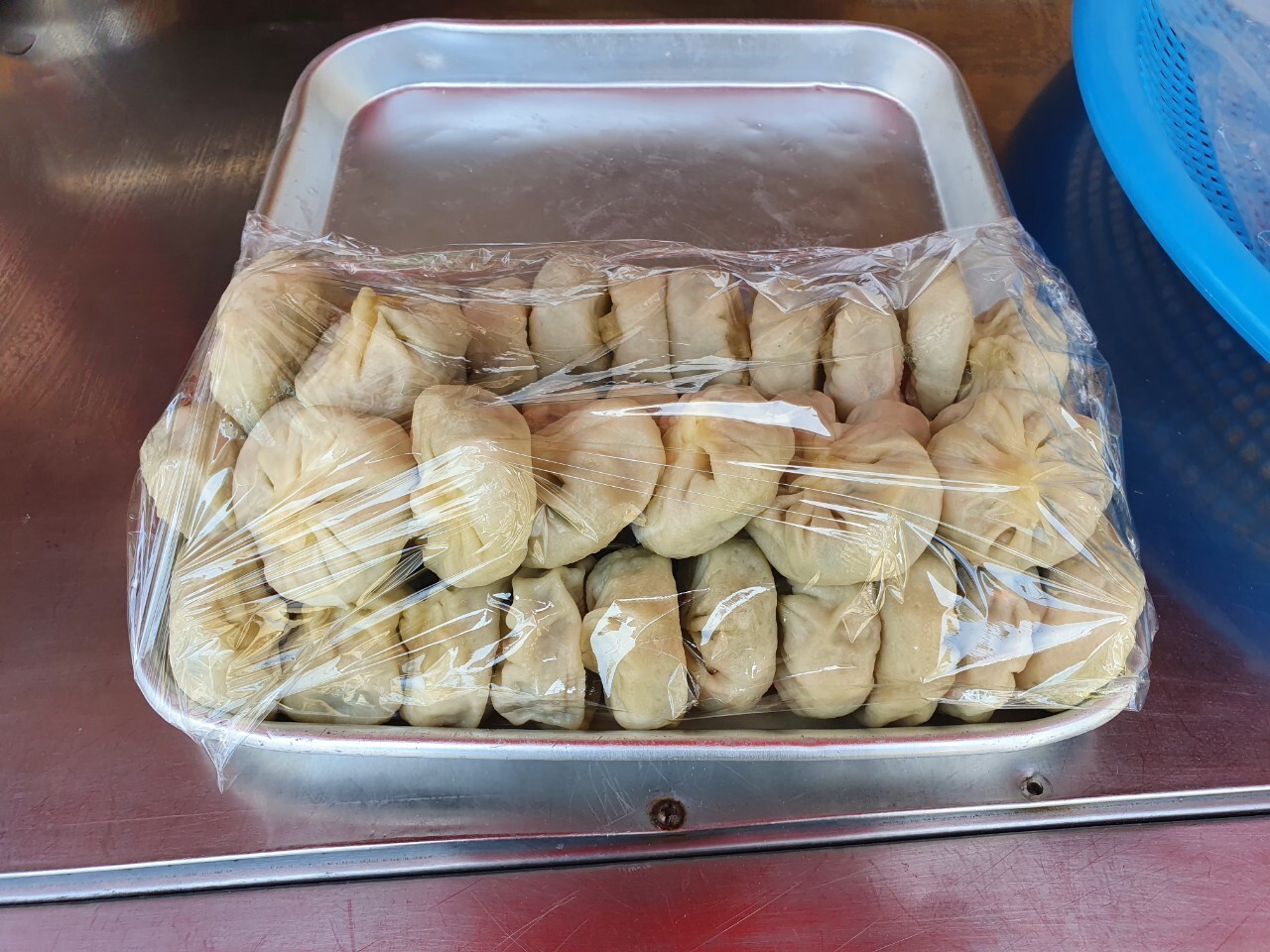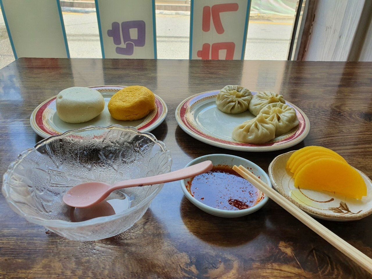 만두와 찐빵이 진열되어 있고