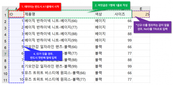 - ID(고유값)이 있을 경우, 반드시 첫번째 열에 입력되어야 하며 DB 오른쪽으로 신규 ID가 입력된 셀이 있어야 합니다.