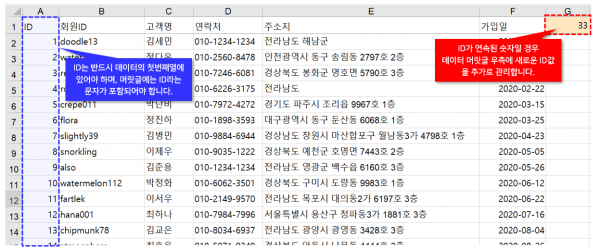 - 고유값이 있을 경우, 고유값의 머릿글은 반드시 "ID"라는 문자를 포함해야 합니다. ID가 연속된 숫자일 경우 데이터의 오른쪽으로 새롭게 추가될 ID 순번을 같이 관리해야 합니다.