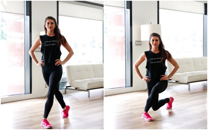 어깨넓이로 발을 벌리고 양손을 허리에 올린다. 왼쪽다리를 오른쪽 다리의 뒷편으로 옮긴다. 양쪽 무릎의 각도가 직각이 될때까지 천천히 무릎을 굽혀준다. 다시 원래대로 돌아오고 반대쪽 다리도 똑같이 진행한다. (20회 3세트)