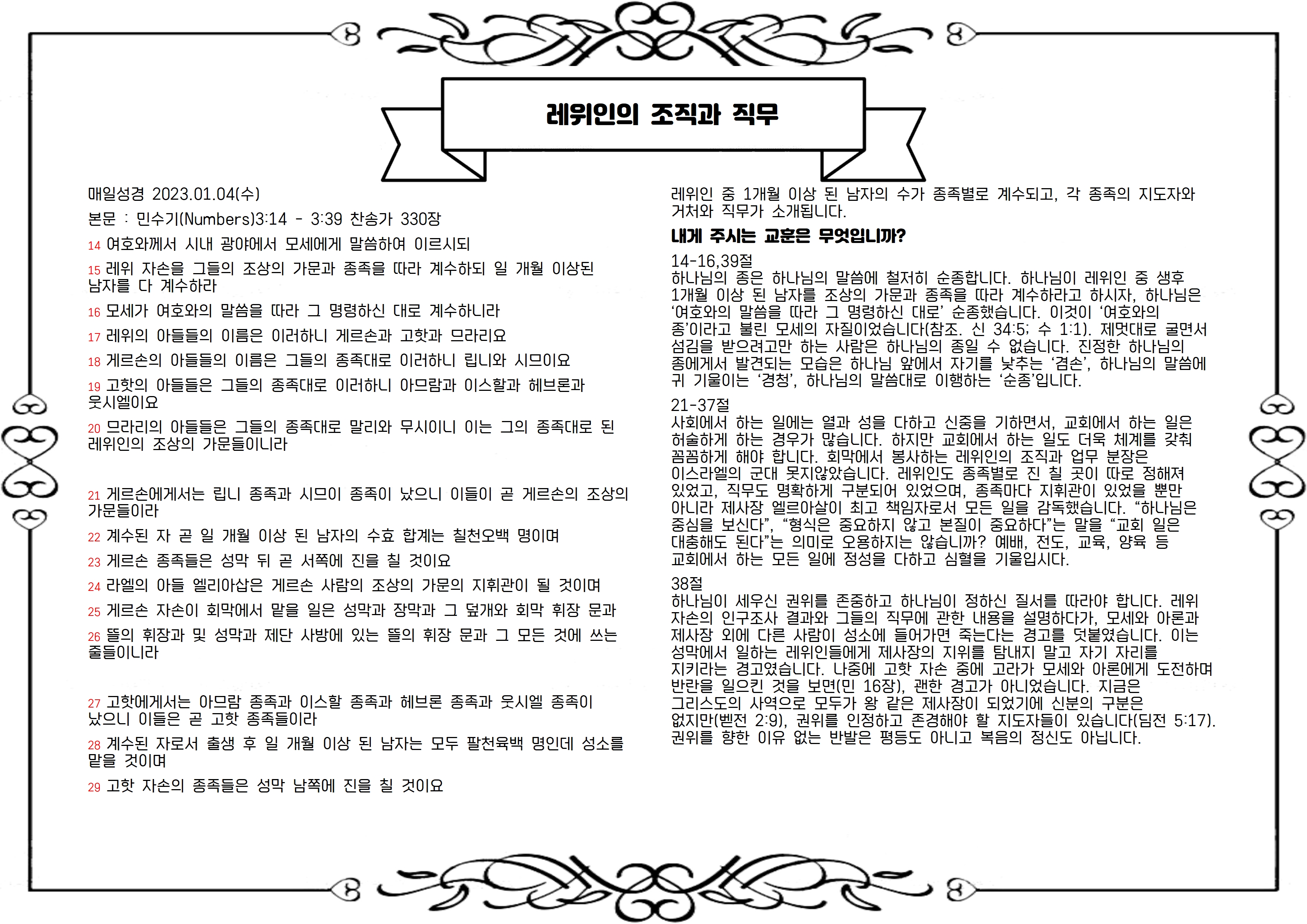 21-37절 사회에서 하는 일에는 열과 성을 다하고 신중을 기하면서, 교회에서 하는 일은 허술하게 하는 경우가 많습니다. 하지만 교회에서 하는 일도 더욱 체계를 갖춰 꼼꼼하게 해야 합니다. 회막에서 봉사하는 레위인의 조직과 업무 분장은 이스라엘의 군대 못지않았습니다. 레위인도 종족별로 진 칠 곳이 따로 정해져 있었고, 직무도 명확하게 구분되어 있었으며, 종족마다 지휘관이 있었을 뿐만 아니라 제사장 엘르아살이 최고 책임자로서 모든 일을 감독했습니다. “하나님은 중심을 보신다”, “형식은 중요하지 않고 본질이 중요하다”는 말을 “교회 일은 대충해도 된다”는 의미로 오용하지는 않습니까? 예배, 전도, 교육, 양육 등 교회에서 하는 모든 일에 정성을 다하고 심혈을 기울입시다.
