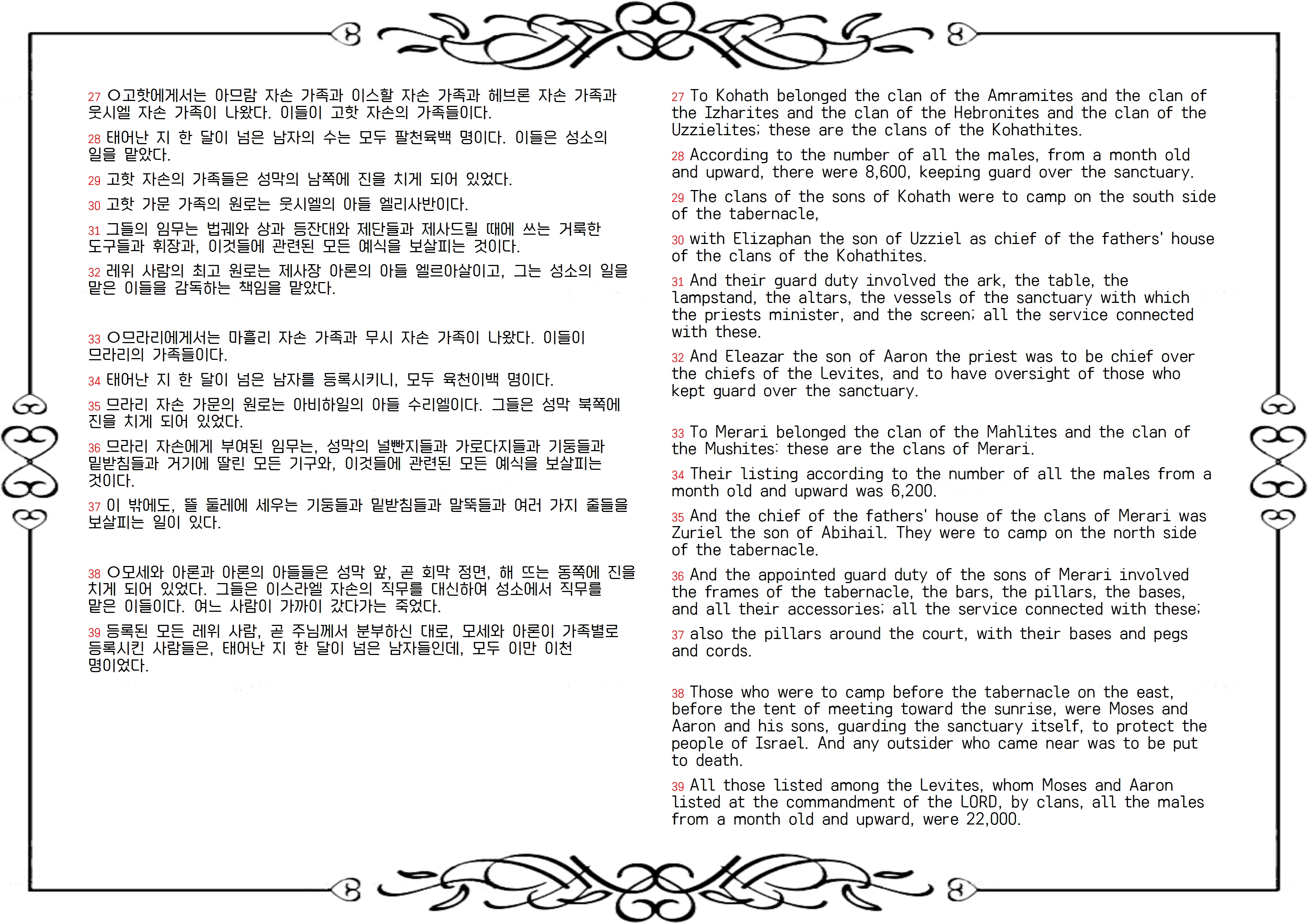 38절 하나님이 세우신 권위를 존중하고 하나님이 정하신 질서를 따라야 합니다. 레위 자손의 인구조사 결과와 그들의 직무에 관한 내용을 설명하다가, 모세와 아론과 제사장 외에 다른 사람이 성소에 들어가면 죽는다는 경고를 덧붙였습니다. 이는 성막에서 일하는 레위인들에게 제사장의 지위를 탐내지 말고 자기 자리를 지키라는 경고였습니다. 나중에 고핫 자손 중에 고라가 모세와 아론에게 도전하며 반란을 일으킨 것을 보면(민 16장), 괜한 경고가 아니었습니다. 지금은 그리스도의 사역으로 모두가 왕 같은 제사장이 되었기에 신분의 구분은 없지만(벧전 2:9), 권위를 인정하고 존경해야 할 지도자들이 있습니다(딤전 5:17). 권위를 향한 이유 없는 반발은 평등도 아니고 복음의 정신도 아닙니다.