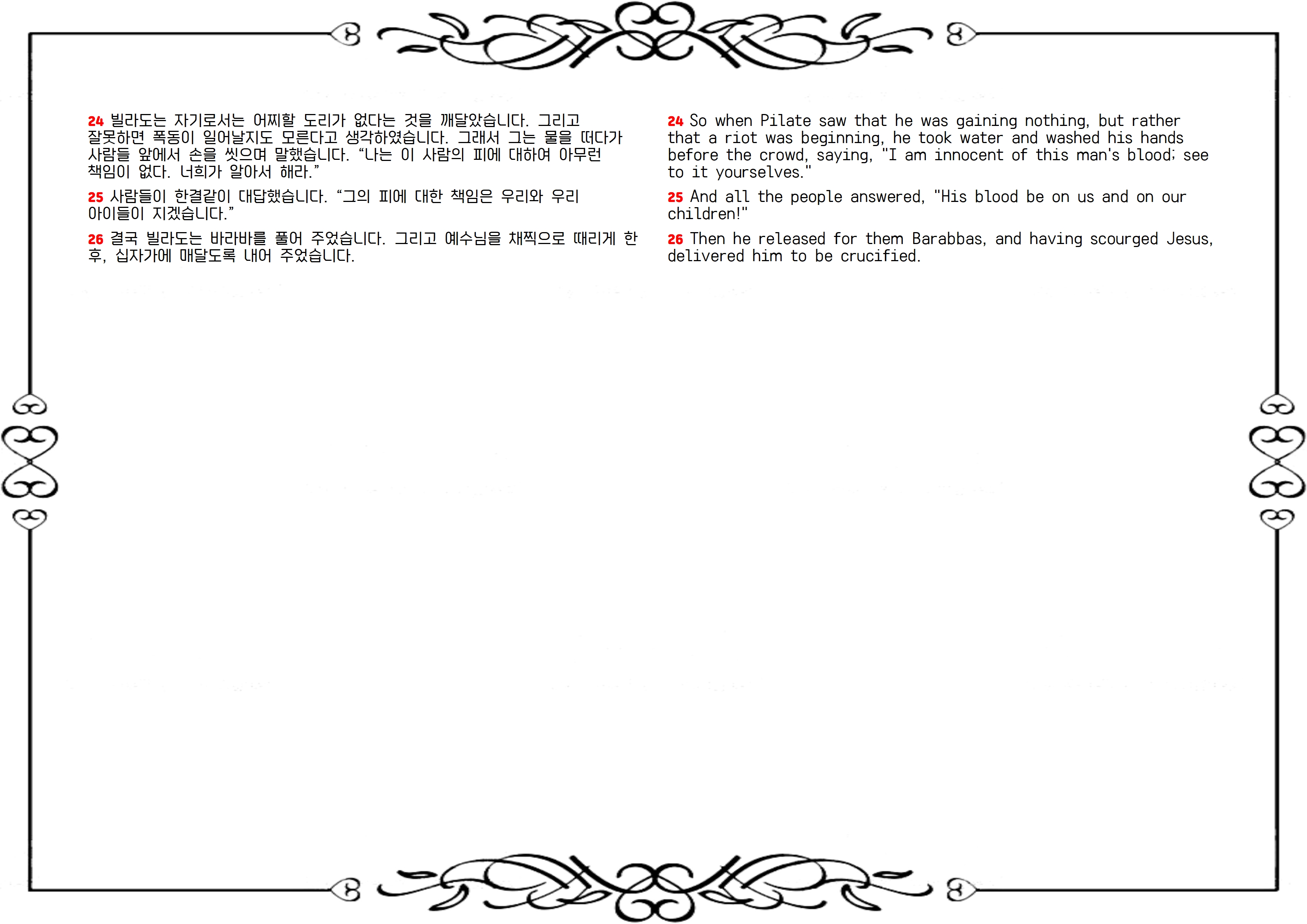 빌라도는 자신을 변호하지 않는 예수님의 태도를 이상히 여겼지만, 그에게 죄가 없음을 알았습니다(13, 14, 18, 19절). 그러나 그는 무죄를 선고하는 대신 명절에 죄인을 방면하는 관습을 통해 예수님을 놓아주는 편을 택합니다(15절). 정직한 판결이 아니라 정치적 선택을 한 것입니다. 그는 ‘예수 바라바’와 ‘그리스도 예수’를 군중 앞에 세우고, 누구를 놓아줄 것인지 묻습니다(15-19절). 대제사장과 장로들의 선동에 휩쓸린 군중이 예수를 십자가에 못 박으라고 소리칩니다. 빌라도는 민란이 날 것이 두려워 예수님을 채찍질한 후에 십자가에 처형하라고 넘겨줍니다(20-26절).