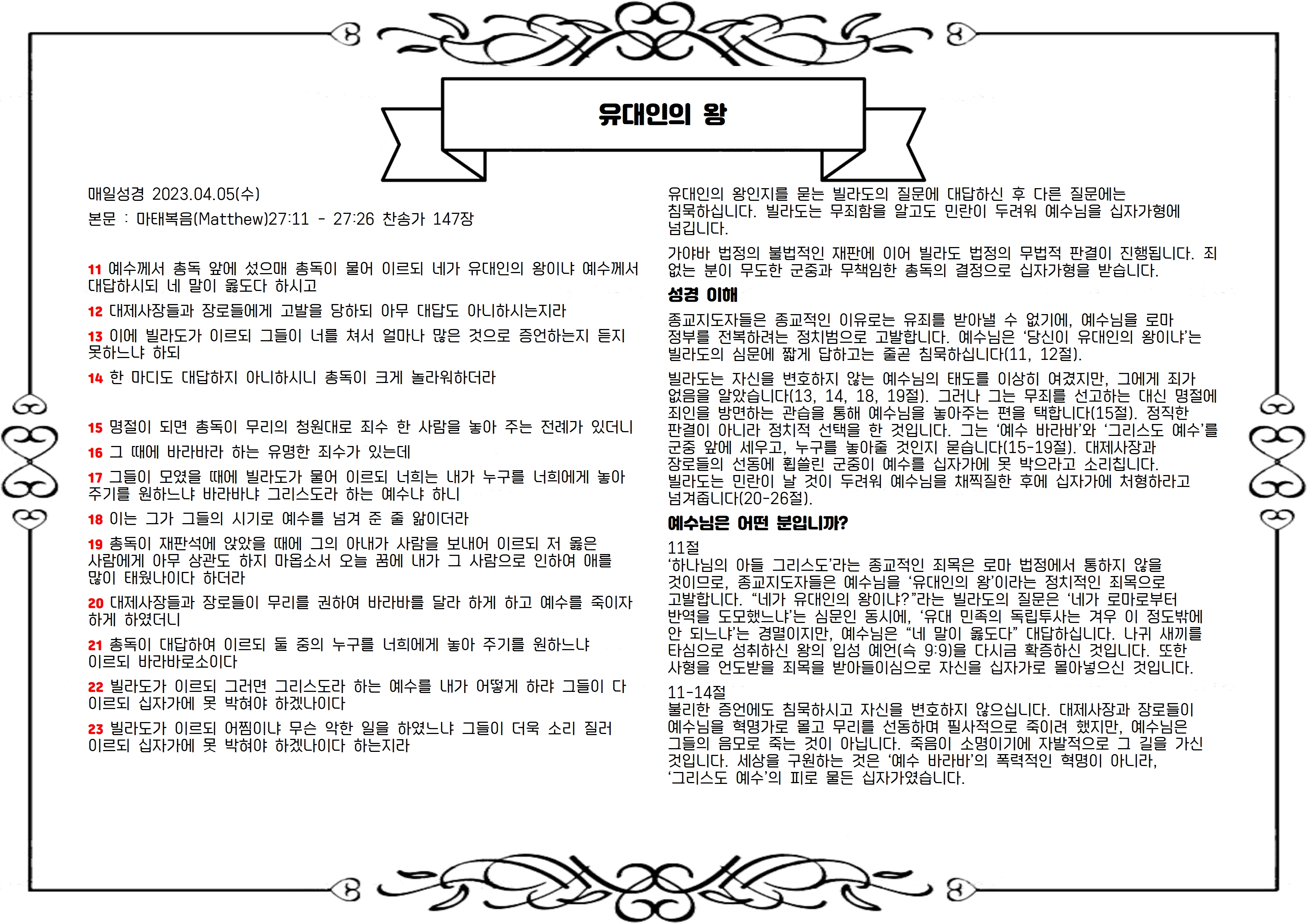 본문 : 마태복음(Matthew)27:11 - 27:26 찬송가 147장