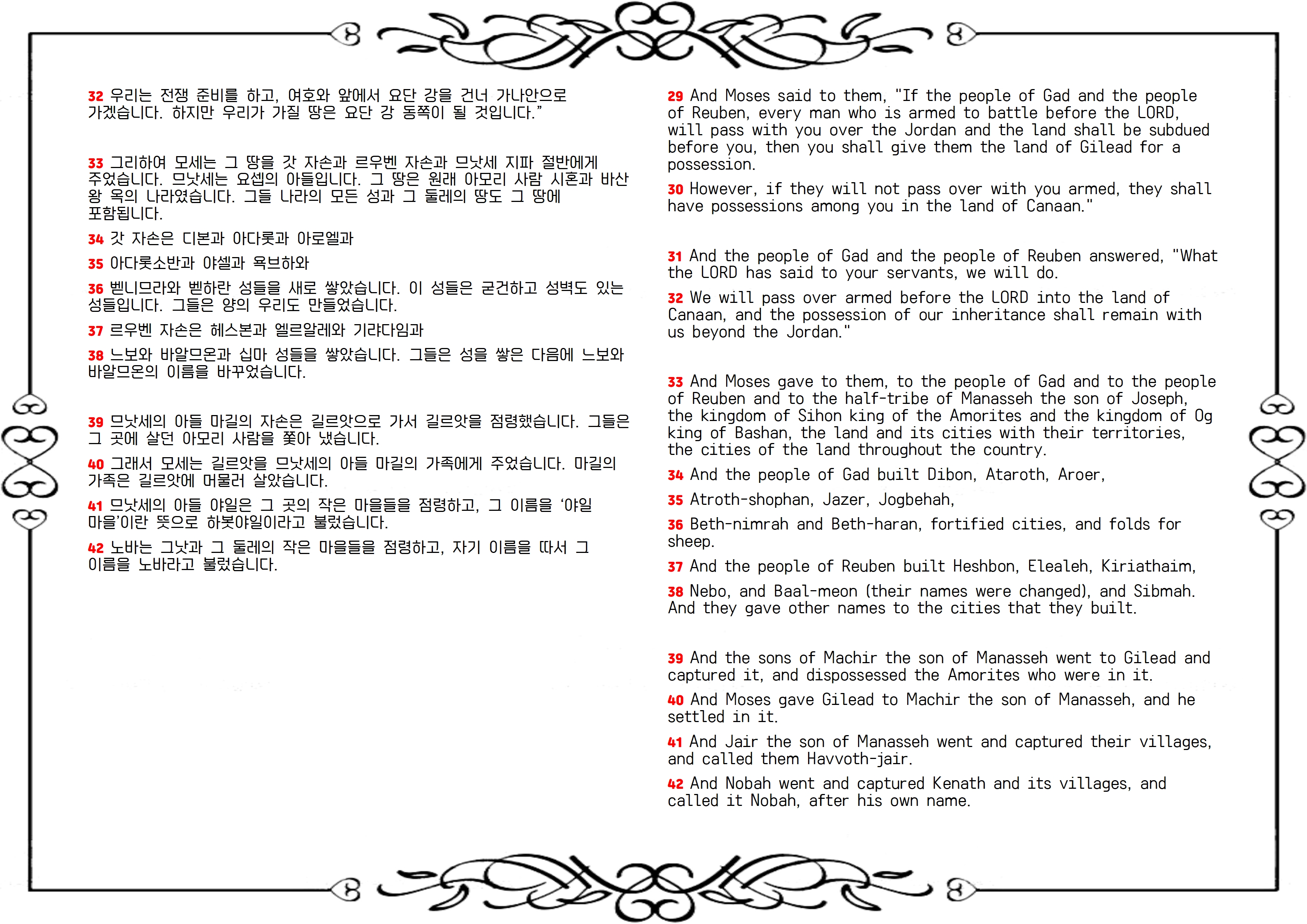 모세는 요단 동편 땅을 갓 자손, 르우벤 자손, 므낫세 반쪽 지파에게 분배합니다. 그 땅은 아모리의 시혼 왕국과 바산의 옥 왕국입니다(33절). 요단 동편의 지파들은 각기 분배받은 땅에 가축을 기를 우리와 요새화된 성읍을 건축합니다(34-42절). 특히 므낫세의 세 아들들은 이미 정복한 땅이 아닌 아모리 사람들이 차지하고 있던 다른 땅을 정복합니다. 모세는 그 땅들을 므낫세 반 지파의 기업으로 줍니다(39, 40절).