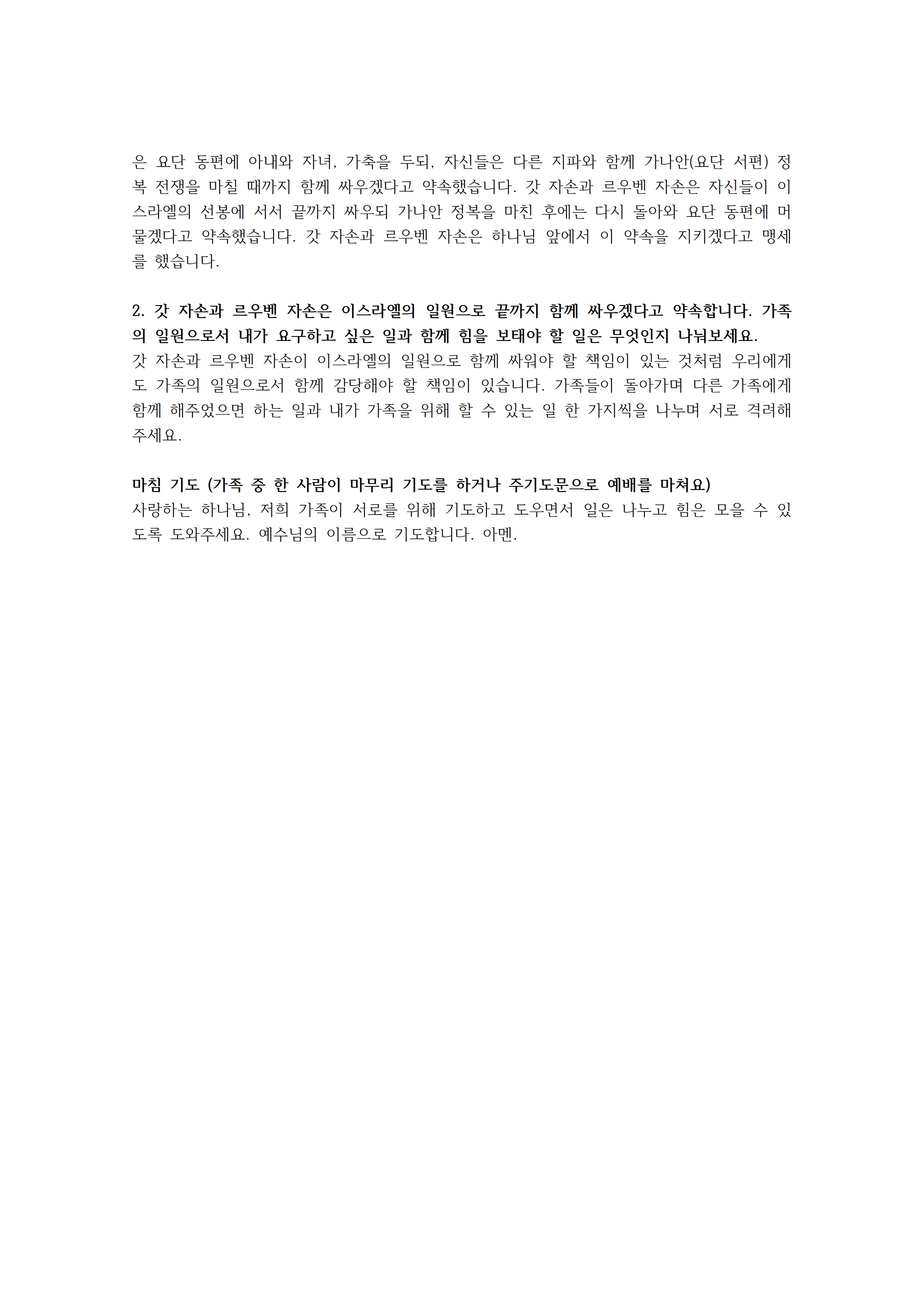 모세가 르우벤과 갓 자손의 제안을 수용하고, 그들이 맹세를 지키면 요단 동편 땅을 얻겠지만 맹세를 어기면 저주를 받을 것이라고 경고합니다(21-24절). 이에 르우벤과 갓 자손이 어린이와 여자들과 가축을 남기고, 자신들은 무장하고 요단을 건너겠다고 다시 다짐합니다(25-27절).