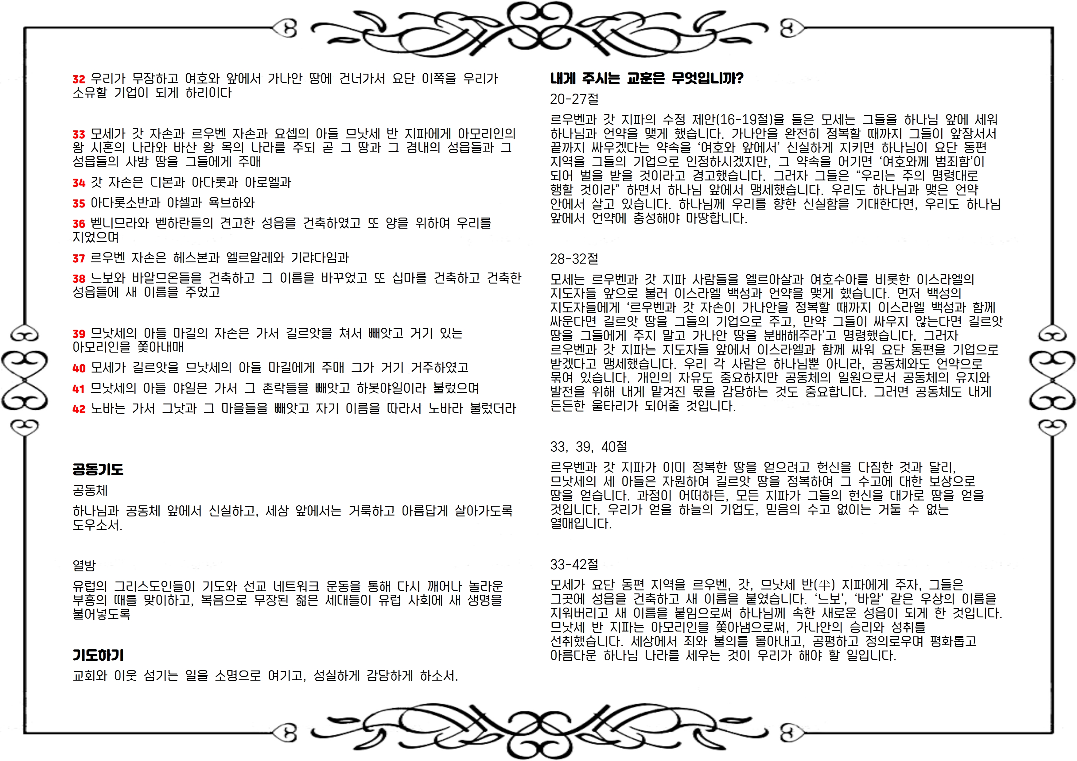 모세는 르우벤과 갓 지파 사람들을 엘르아살과 여호수아를 비롯한 이스라엘의 지도자들 앞으로 불러 이스라엘 백성과 언약을 맺게 했습니다. 먼저 백성의 지도자들에게 ‘르우벤과 갓 자손이 가나안을 정복할 때까지 이스라엘 백성과 함께 싸운다면 길르앗 땅을 그들의 기업으로 주고, 만약 그들이 싸우지 않는다면 길르앗 땅을 그들에게 주지 말고 가나안 땅을 분배해주라’고 명령했습니다. 그러자 르우벤과 갓 지파는 지도자들 앞에서 이스라엘과 함께 싸워 요단 동편을 기업으로 받겠다고 맹세했습니다. 우리 각 사람은 하나님뿐 아니라, 공동체와도 언약으로 묶여 있습니다. 개인의 자유도 중요하지만 공동체의 일원으로서 공동체의 유지와 발전을 위해 내게 맡겨진 몫을 감당하는 것도 중요합니다. 그러면 공동체도 내게 든든한 울타리가 되어줄 것입니다.