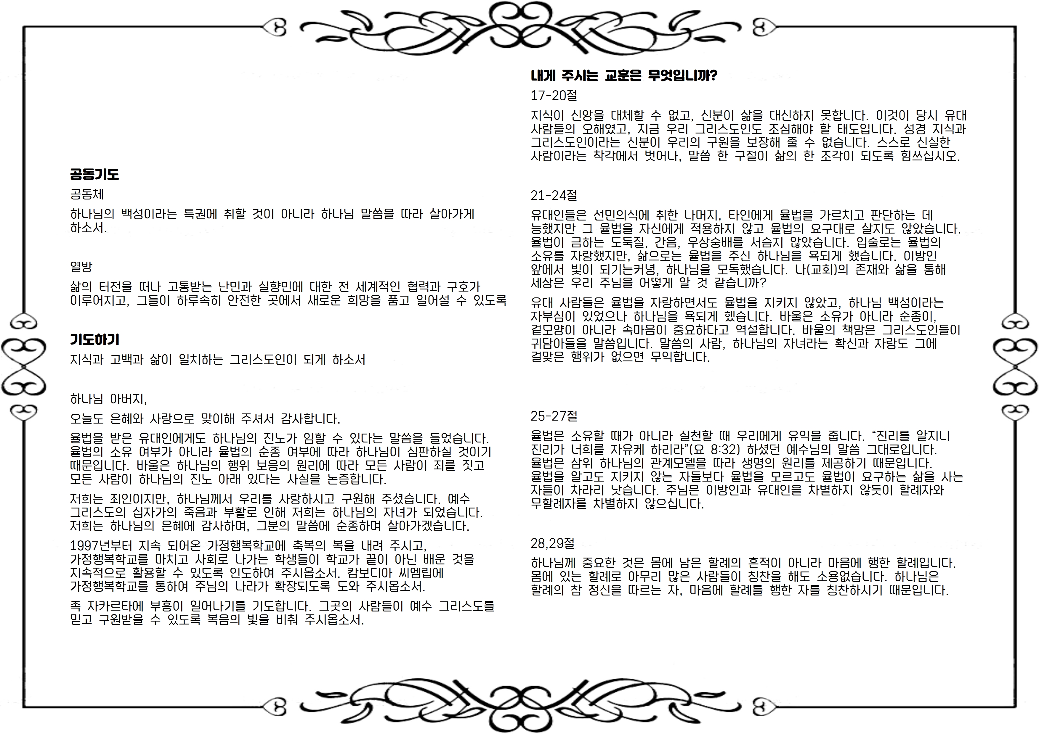 율법은 소유할 때가 아니라 실천할 때 우리에게 유익을 줍니다. “진리를 알지니 진리가 너희를 자유케 하리라”(요 8:32) 하셨던 예수님의 말씀 그대로입니다. 율법은 삼위 하나님의 관계모델을 따라 생명의 원리를 제공하기 때문입니다. 율법을 알고도 지키지 않는 자들보다 율법을 모르고도 율법이 요구하는 삶을 사는 자들이 차라리 낫습니다. 주님은 이방인과 유대인을 차별하지 않듯이 할례자와 무할례자를 차별하지 않으십니다.