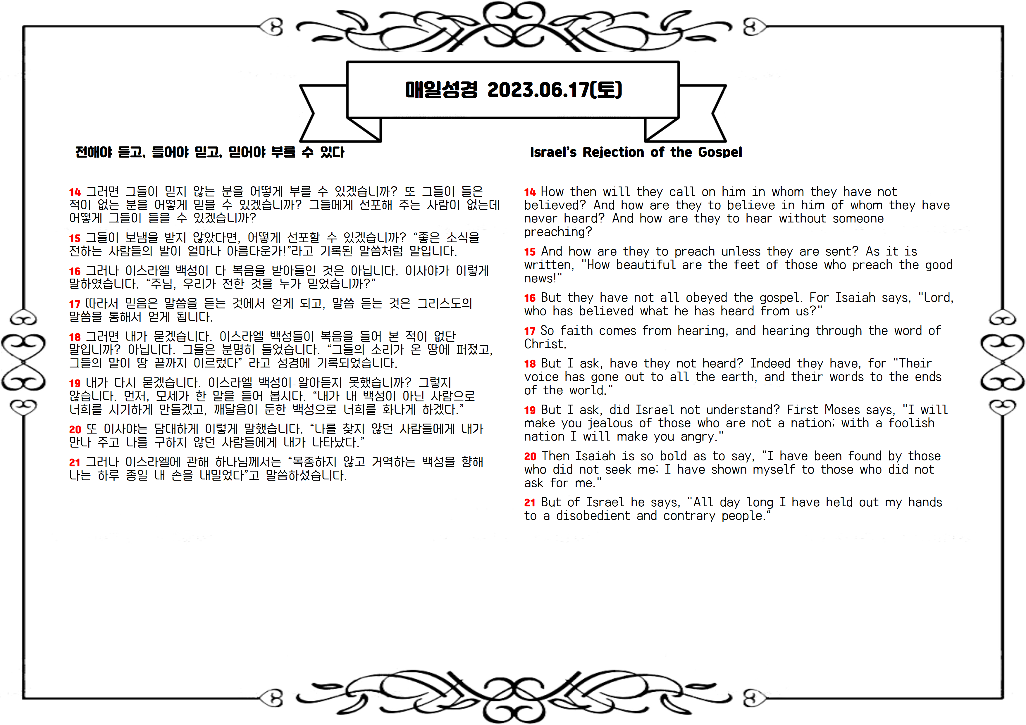 믿음으로 얻는 의의 복음을 들은 바 없다고 항의하는 유대인을 향해, 사도는 구약을 인용하며 ‘주님은 가르치셨는데 이스라엘이 듣지 않고 믿지 않았다’고 반박합니다.