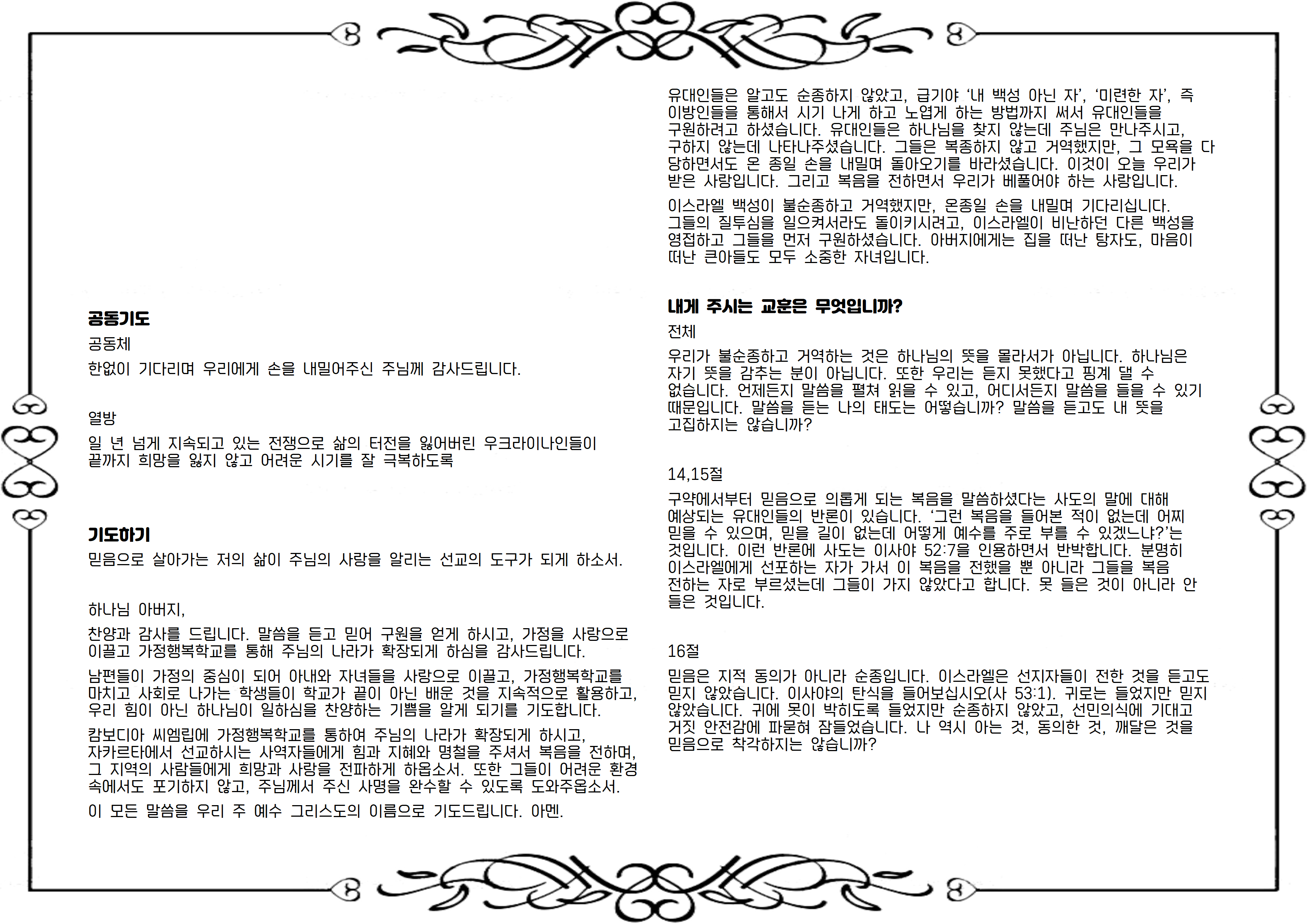 남편들이 가정의 중심이 되어 아내와 자녀들을 사랑으로 이끌고, 가정행복학교를 마치고 사회로 나가는 학생들이 학교가 끝이 아닌 배운 것을 지속적으로 활용하고, 우리 힘이 아닌 하나님이 일하심을 찬양하는 기쁨을 알게 되기를 기도합니다.