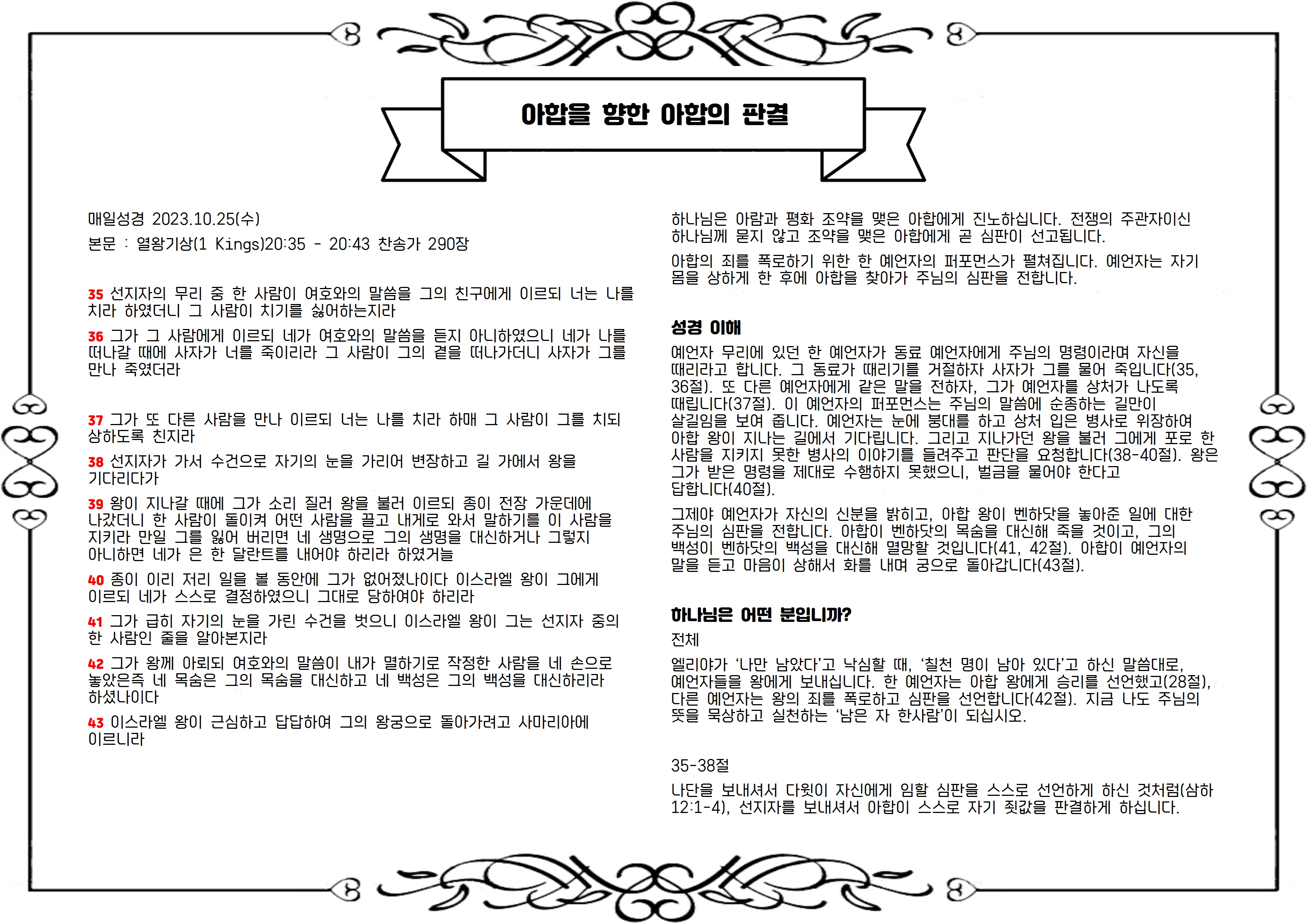본문 : 열왕기상(1 Kings)20:35 - 20:43 찬송가 290장