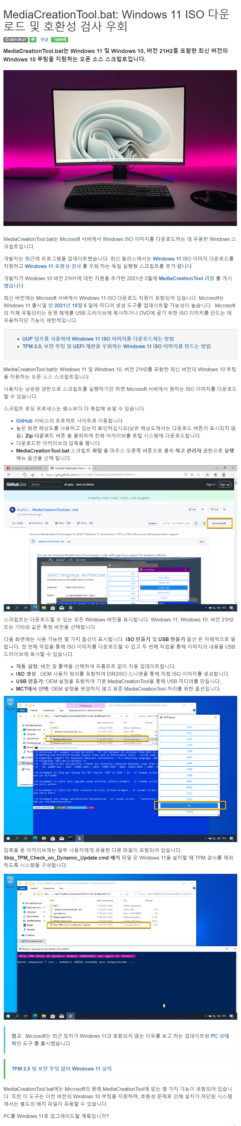 아래 스크립트 툴로 Windows 11 ISO를 만들면 TPM 우회패치가 됩니다..ㅎ
