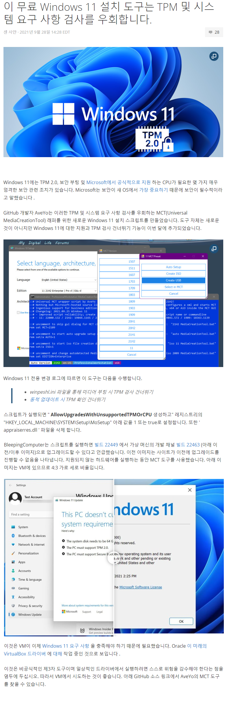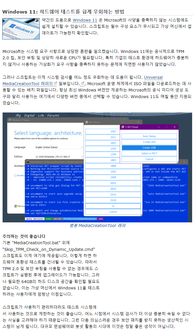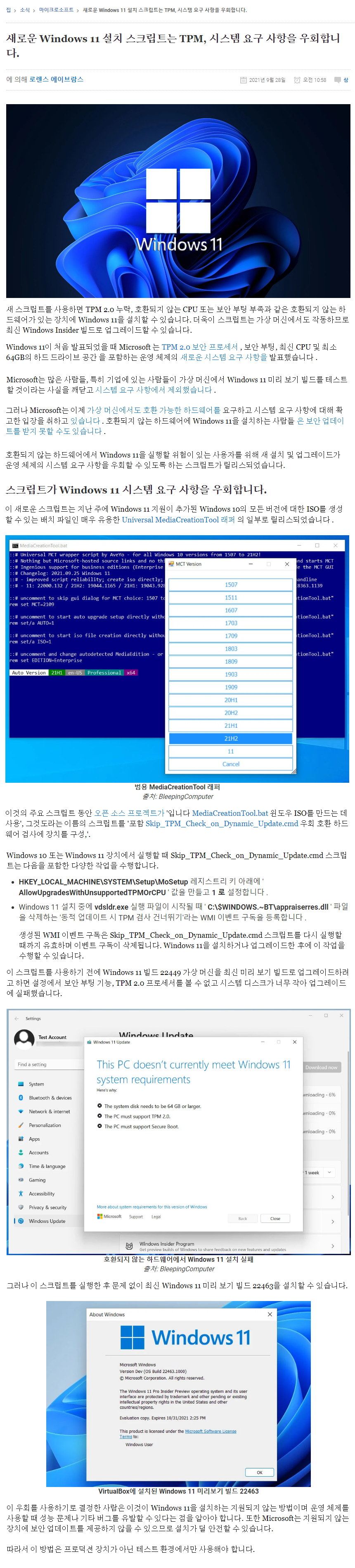 새로운 TPM 우회 방법 : 클린설치는 기존 TPM 우회방식을 사용했고, 윈도우상에서 업그레이드시 잘 진행됩니다.