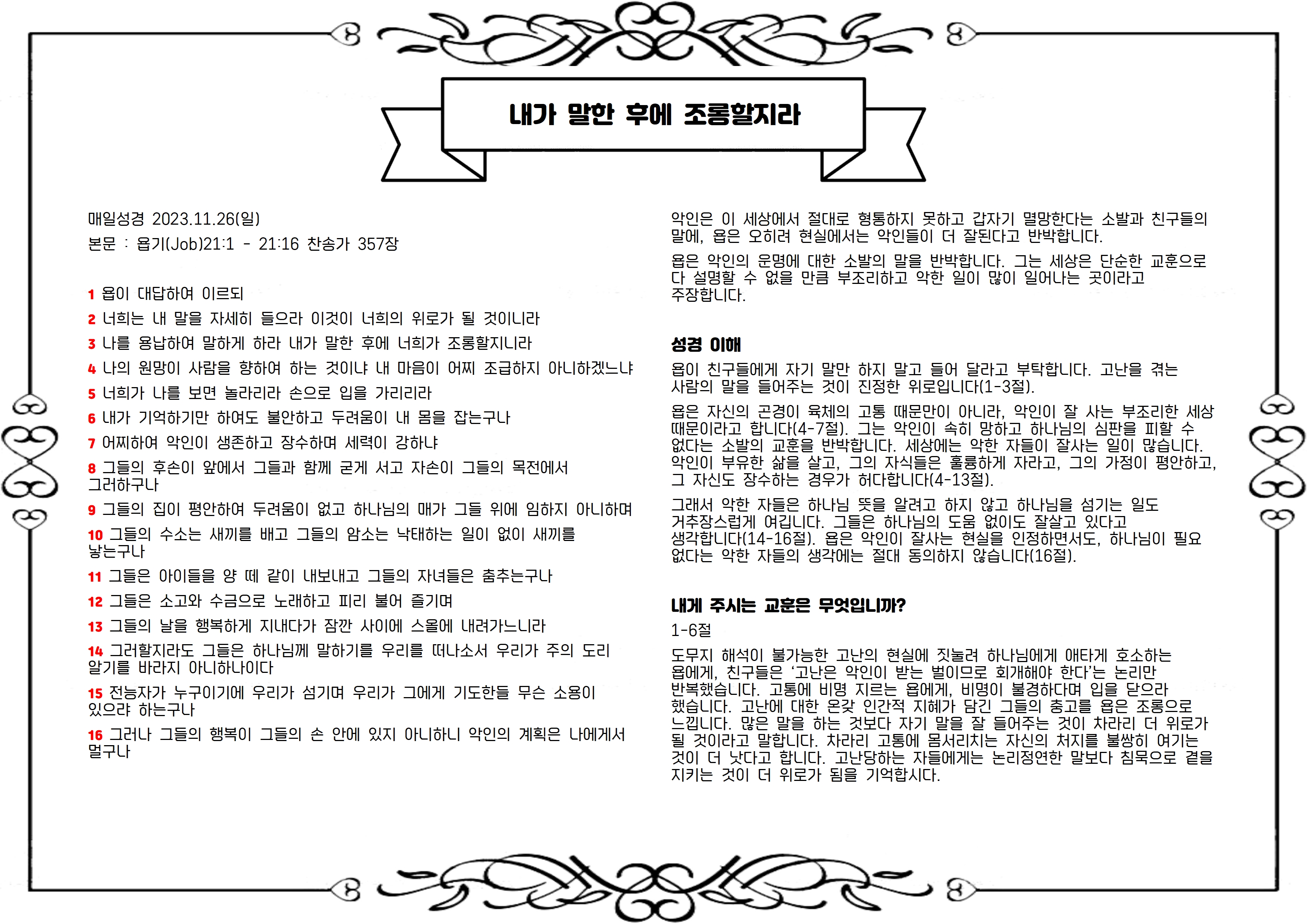 욥이 친구들에게 자기 말만 하지 말고 들어 달라고 부탁합니다. 고난을 겪는 사람의 말을 들어주는 것이 진정한 위로입니다(1-3절).