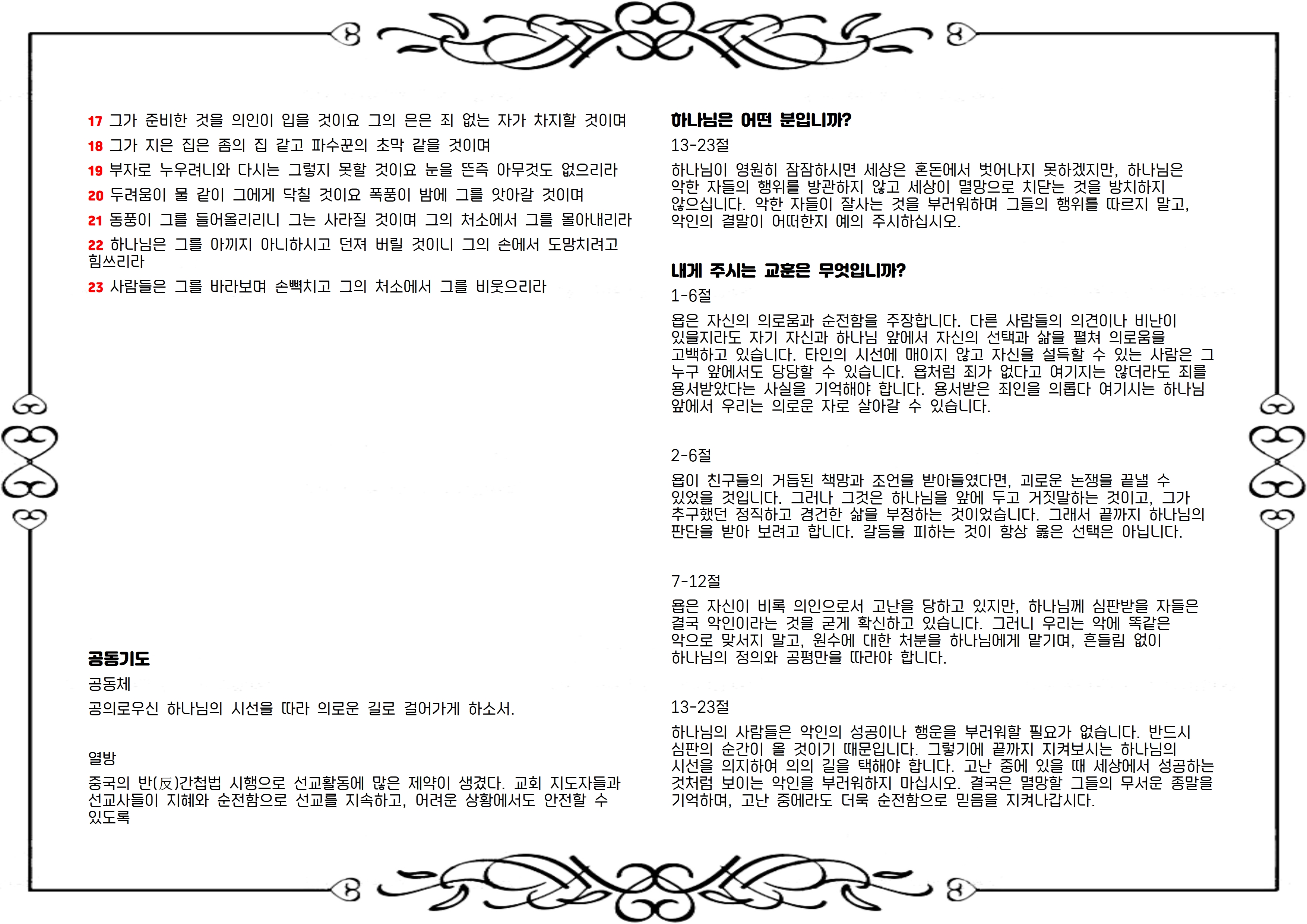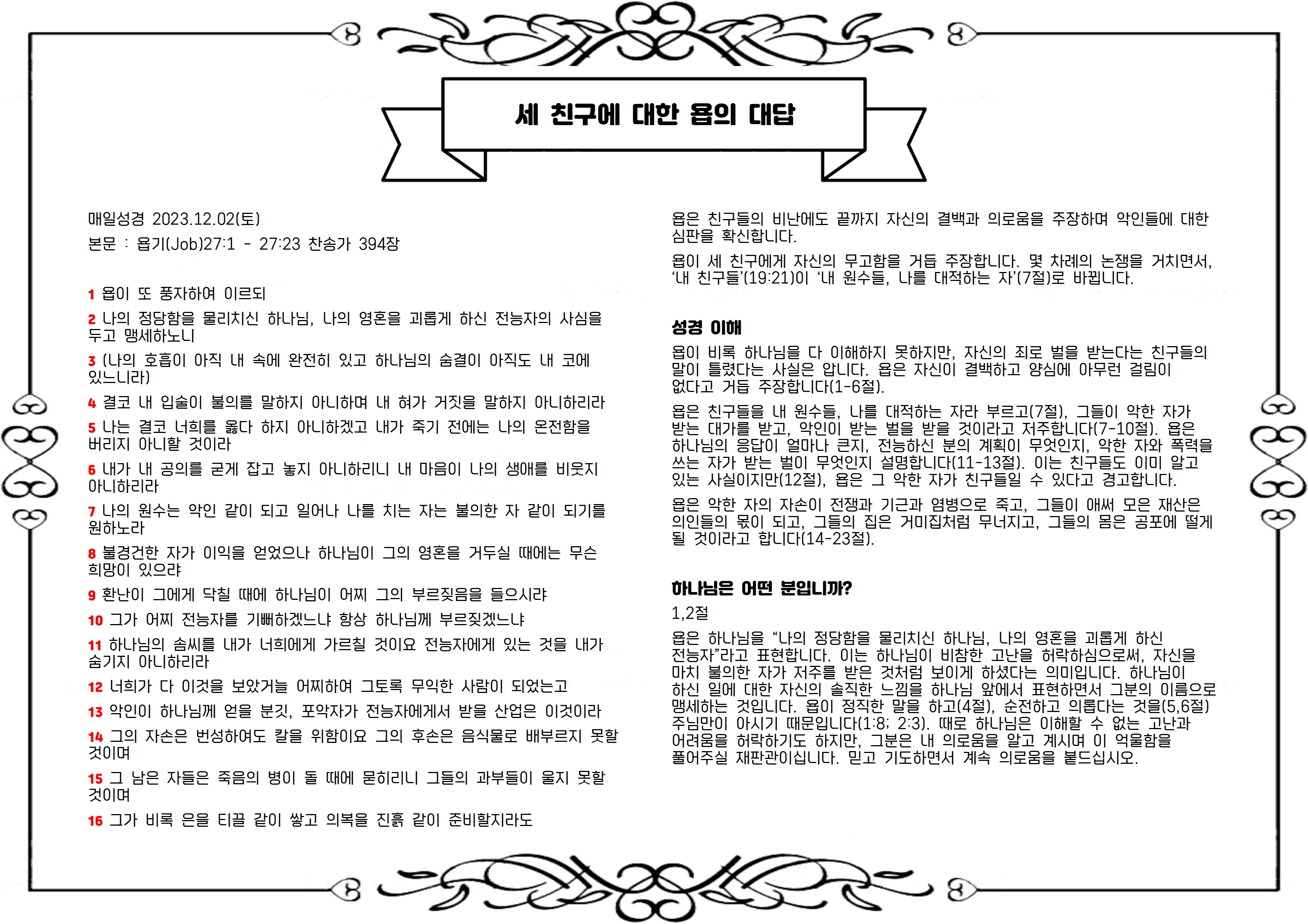 본문 : 욥기(Job)27:1 - 27:23 찬송가 394장