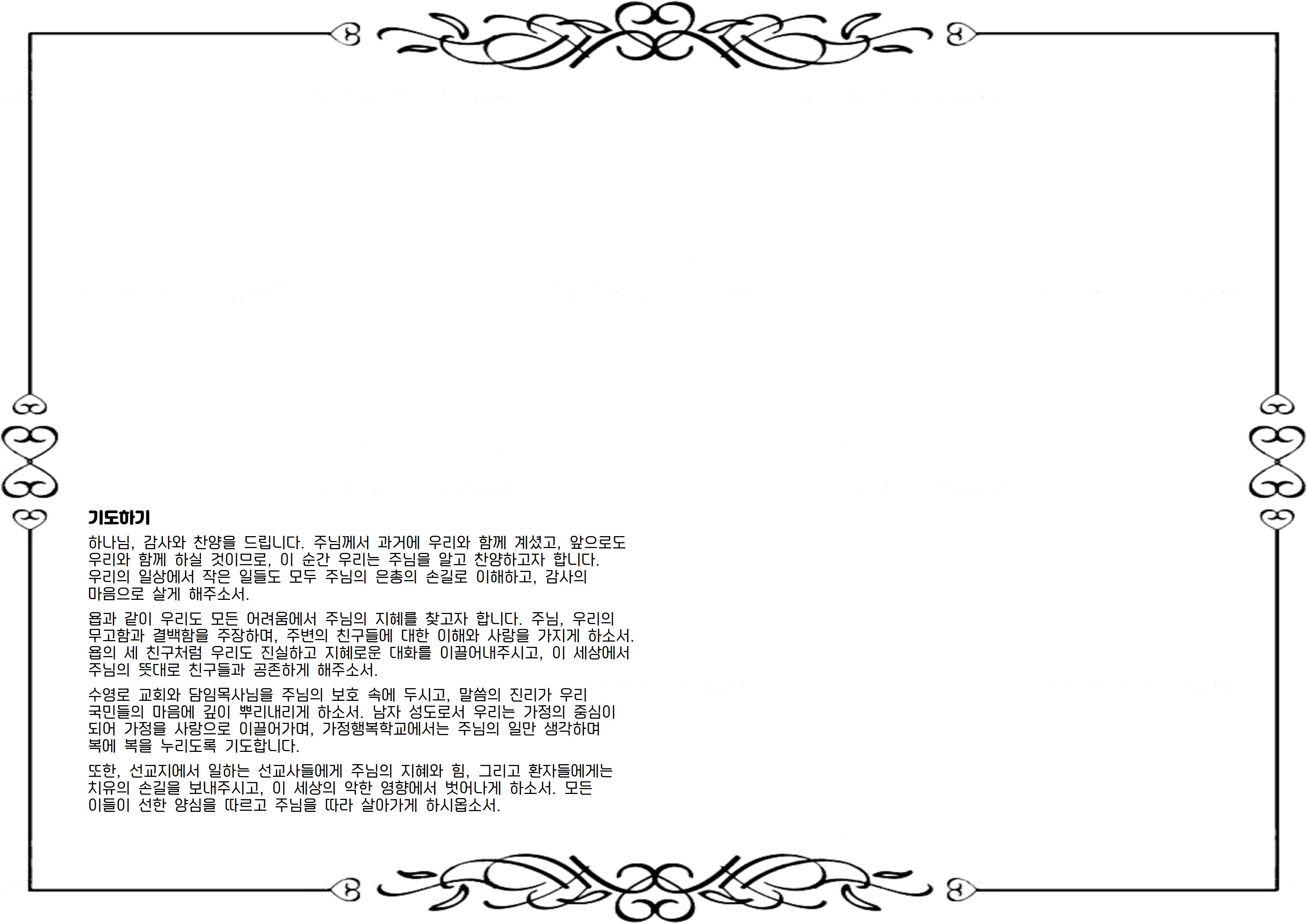 수영로 교회와 담임목사님을 주님의 보호 속에 두시고, 말씀의 진리가 우리 국민들의 마음에 깊이 뿌리내리게 하소서. 남자 성도로서 우리는 가정의 중심이 되어 가정을 사랑으로 이끌어가며, 가정행복학교에서는 주님의 일만 생각하며 복에 복을 누리도록 기도합니다.
