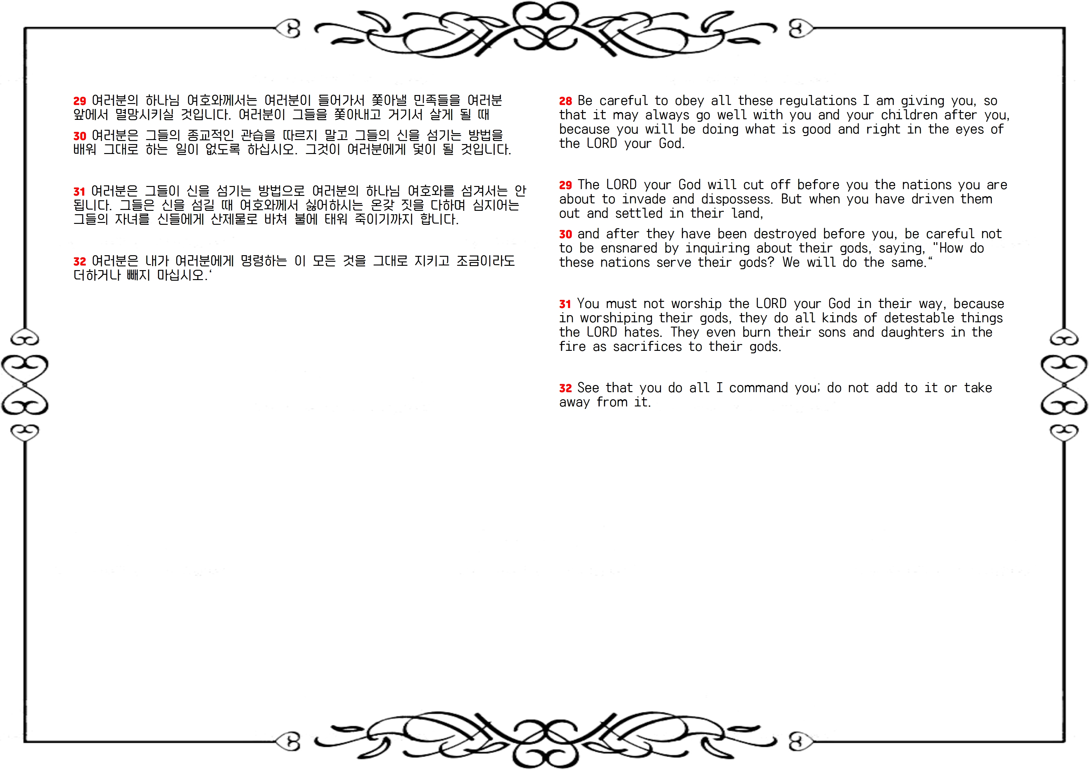 32 여러분은 내가 여러분에게 명령하는 이 모든 것을 그대로 지키고 조금이라도 더하거나 빼지 마십시오.‘