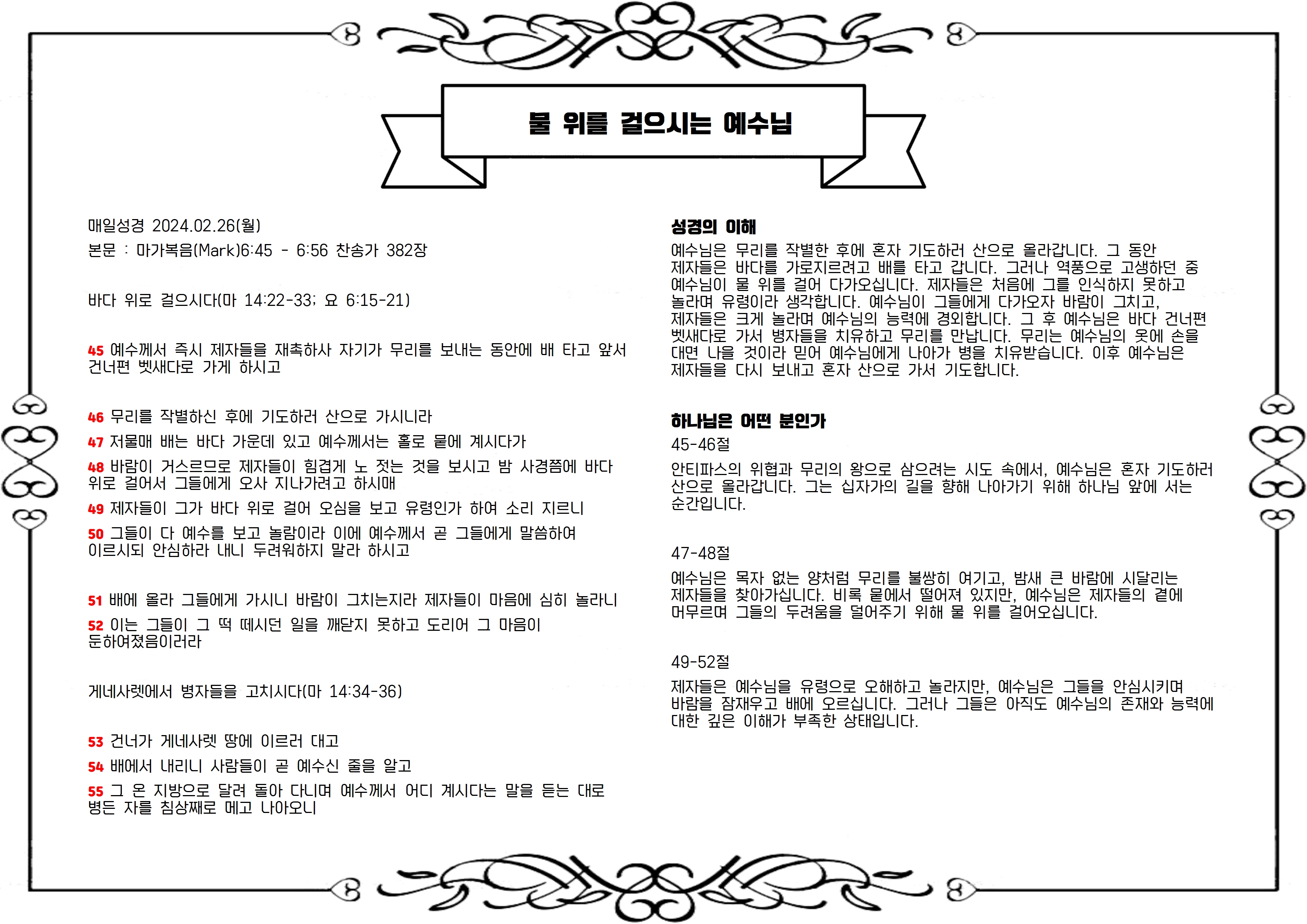 본문 : 마가복음(Mark)6:45 - 6:56 찬송가 382장