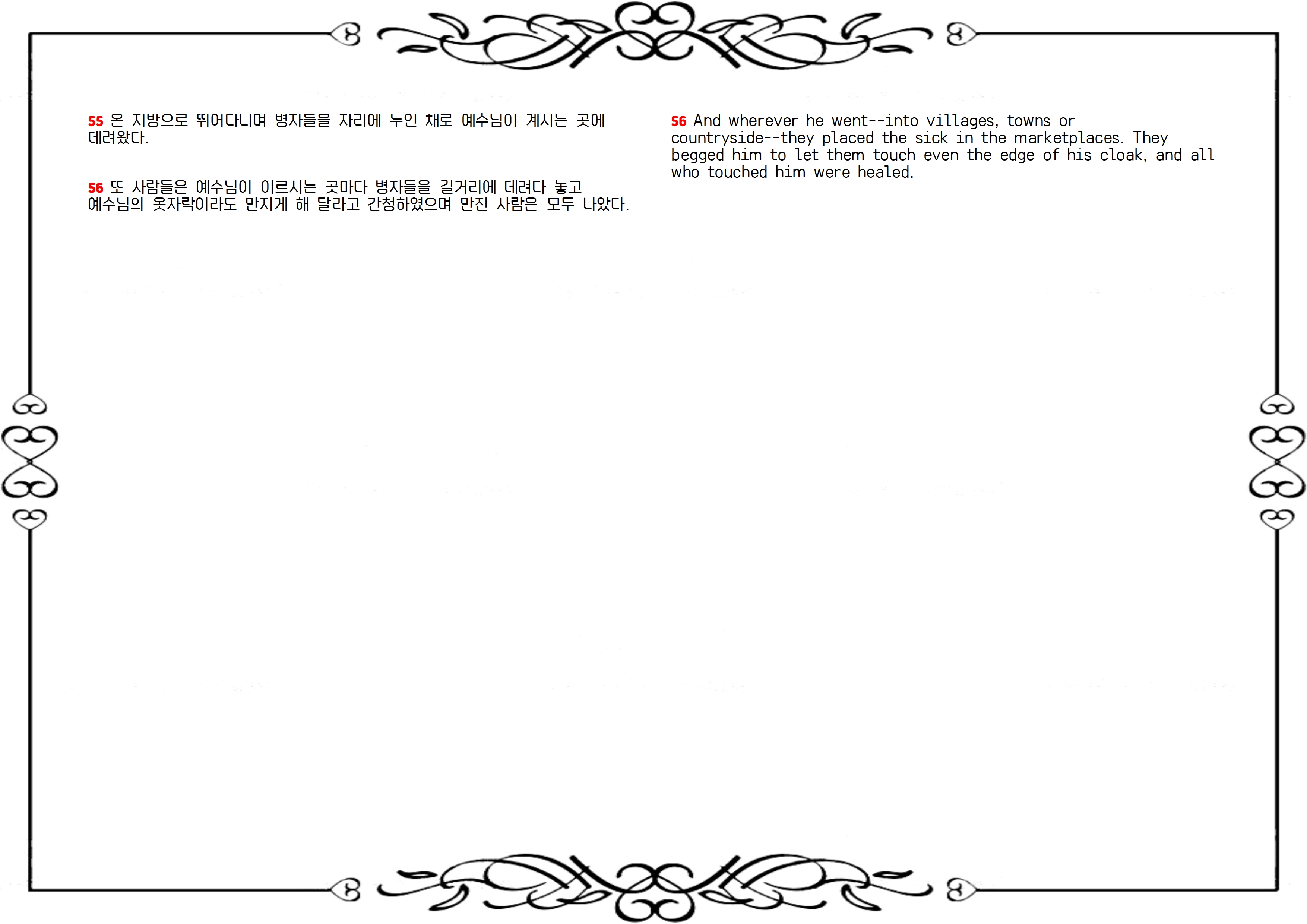 56 또 사람들은 예수님이 이르시는 곳마다 병자들을 길거리에 데려다 놓고 예수님의 옷자락이라도 만지게 해 달라고 간청하였으며 만진 사람은 모두 나았다.
