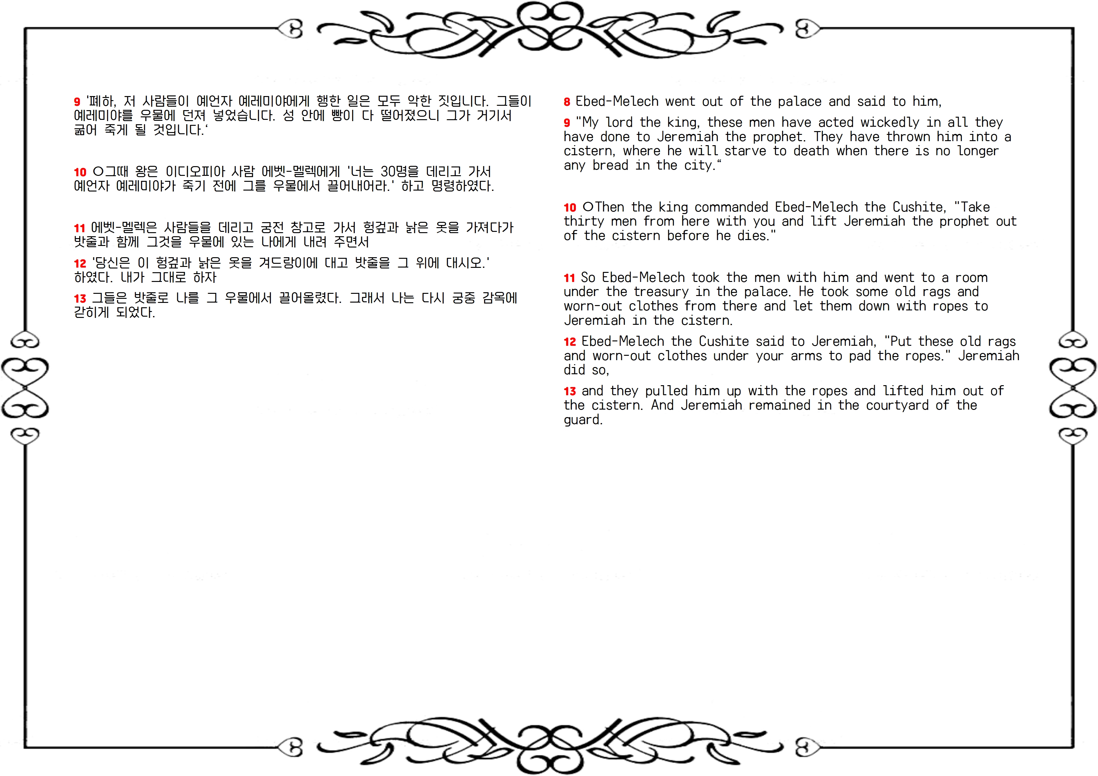 8-9절 : 에벳멜렉은 왕궁을 떠나 왕에게 나아가 말했습니다. "내 주 왕이여, 이 사람들이 예레미야 선지자에게 행한 모든 일은 악합니다. 그들이 그를 물웅덩이에 던졌으니, 그가 그곳에서 굶어 죽을 것입니다. 성 안에 더 이상 빵이 없습니다."