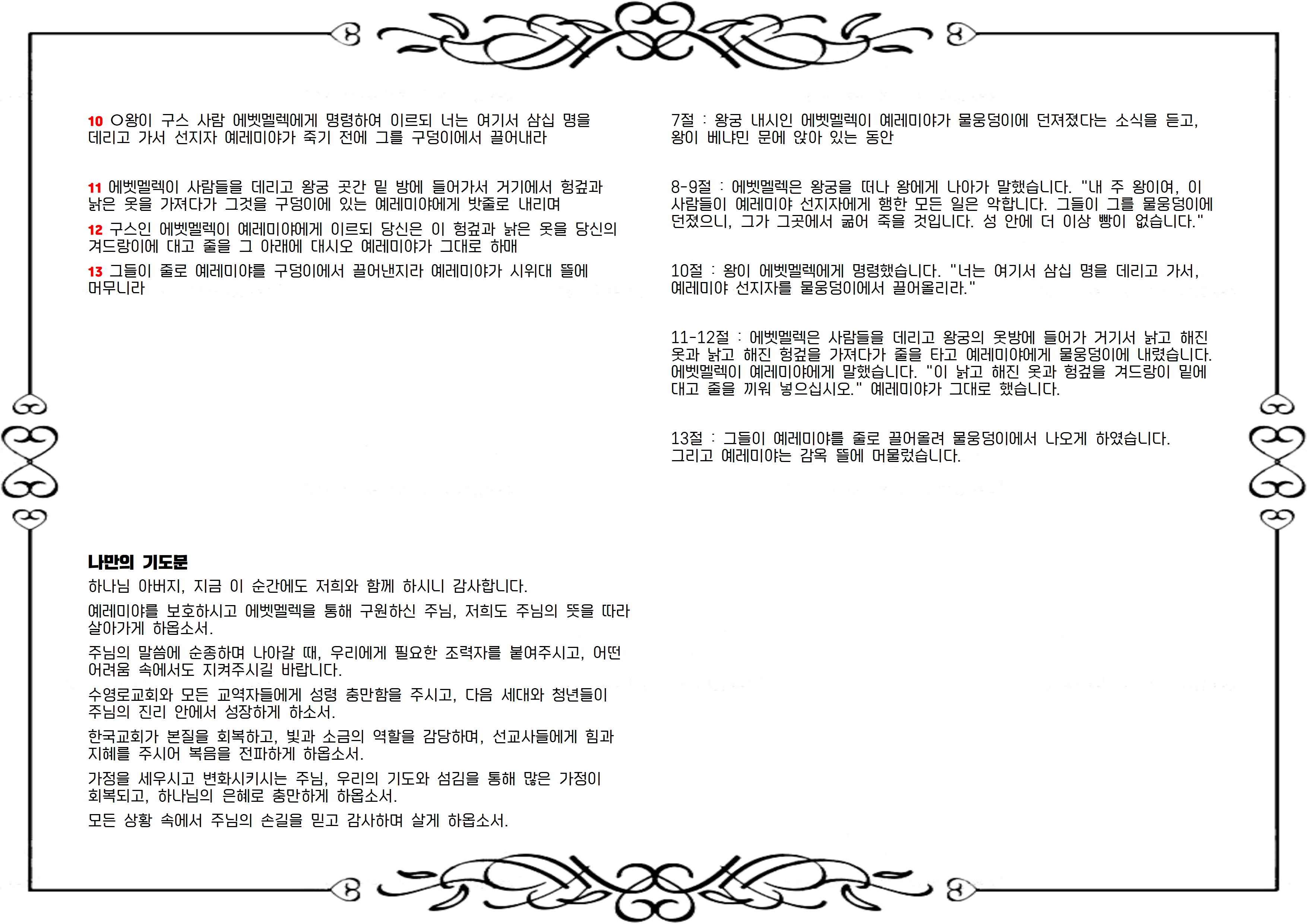예레미야를 보호하시고 에벳멜렉을 통해 구원하신 주님, 저희도 주님의 뜻을 따라 살아가게 하옵소서.