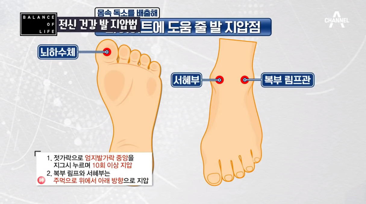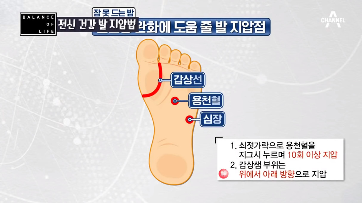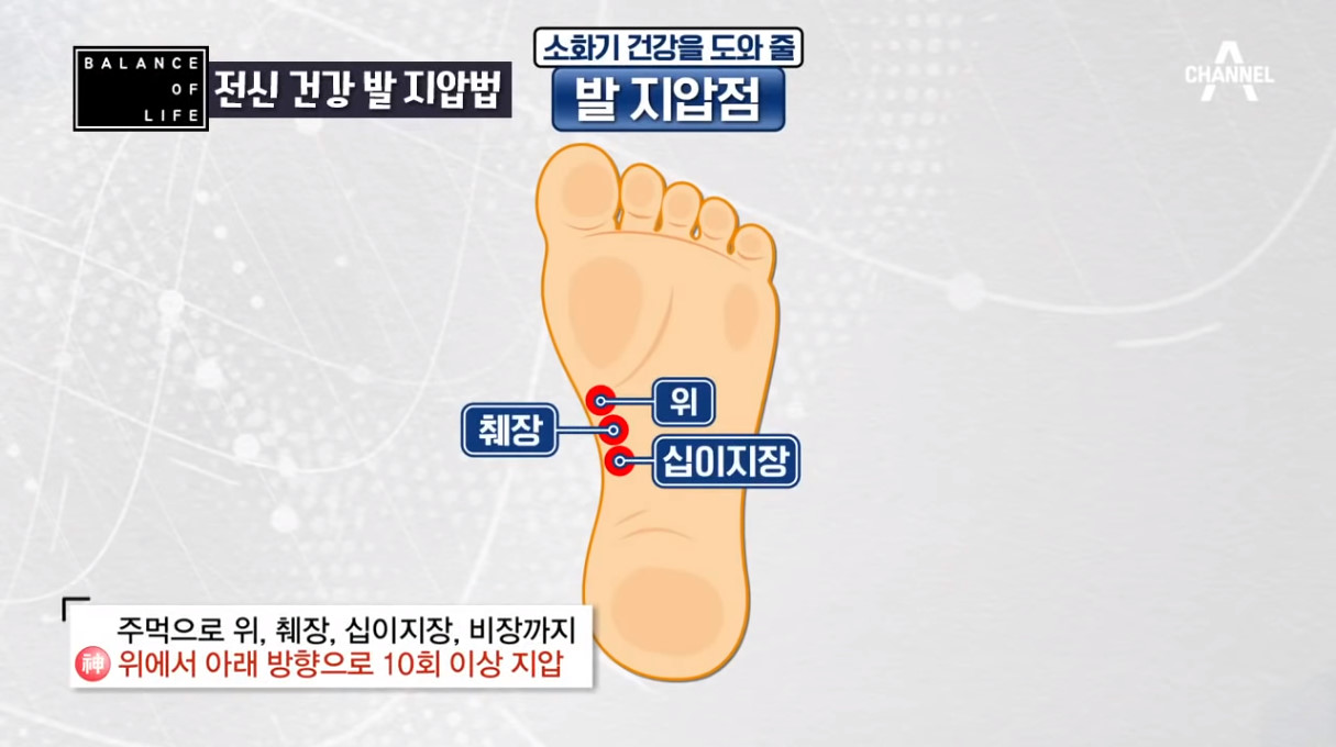 채널A ‘나는 몸신이다’에서는 누르기만 해도 전신 건강을 지킬 수 있다는 발 지압법 5가지를 소개해 화제를 모았다. 이날 3대째 가업을 이어받은 20년 경력 발 지압 전문가 홍혜정 님은 집에서 누구나 쉽게 할 수 있는 셀프 발 지압으로 불면증은 물론 다이어트, 소화기 건강, 비뇨기 및 성기능 강화, 난임 완화에 도움을 준다는 증상별 발 지압법 5가지를 소개했다.